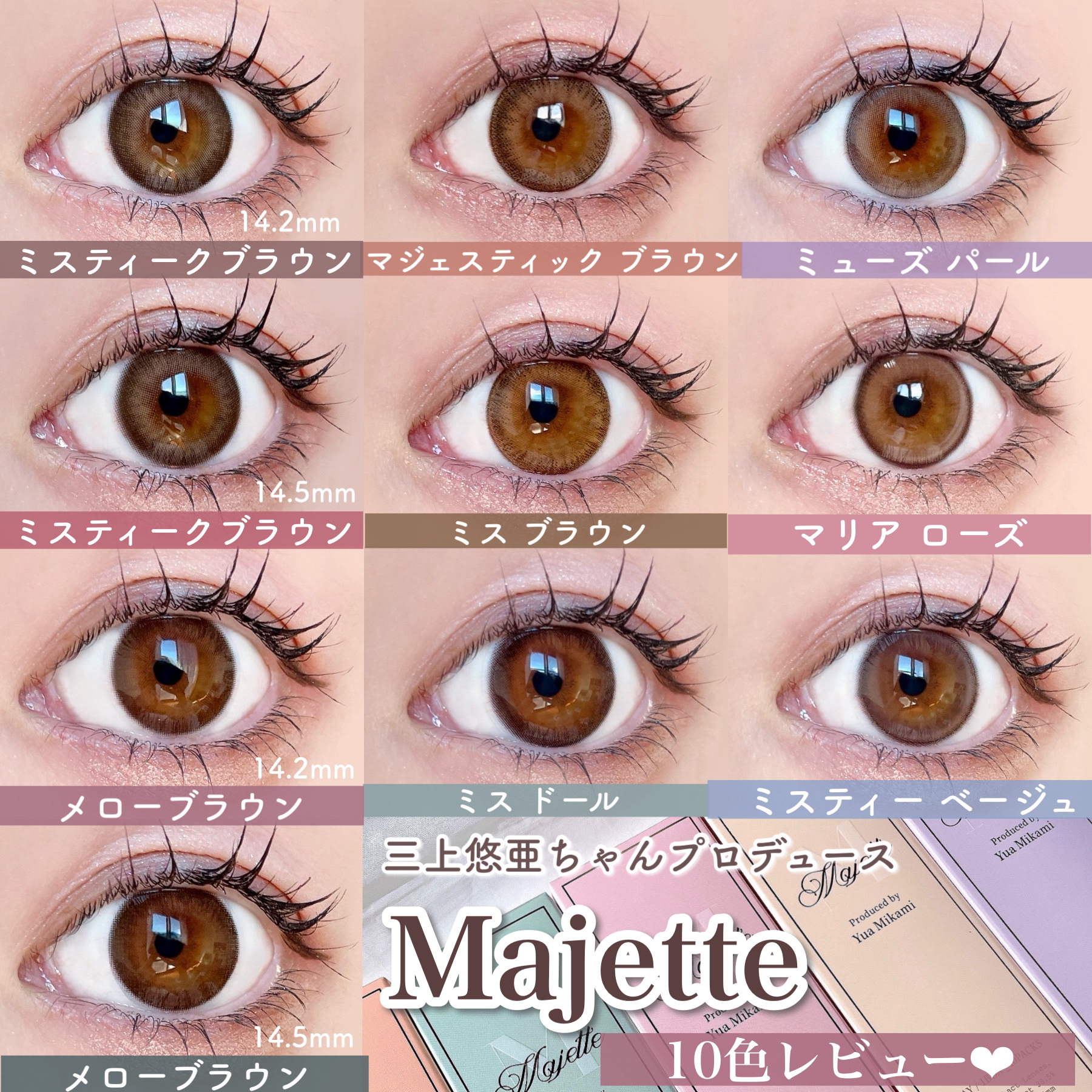 - エレガントに盛れる、瞳に纏うドレス「Majette(マジェット)」 瞳の美シルエットが叶うレディなカラコン ※度数展開はカラーパターン毎に異なりますので、ご注意ください。 ※「ミスティークブラウン」「メローブラウン」の仕様違い(DIA14.2・着色直径13.6)の商品はメーカー公式通販限定となっておりLIPSではお取り扱いがございません。 カラーコンタクトレンズの不適正使用による眼障害の危険性等などがあります。 ●コンタクトレンズは高度管理医療機器です。不十分な洗浄・消毒など不適切なケアや、長時間・交換期間を超えた装用により、アレルギー性結膜炎、角膜感染症、角膜潰瘍等の重篤な眼障害が発生する危険性があります ●ご使用前に取扱説明書を確認してください 使用上の留意事項 ●眼科医院等を受診してからお求めください ●眼に異常を感じたら直ちにレンズ使用を中止し、お近くの眼科等で診察を受けてください ●医師の指示にしたがってご使用ください ●コンタクトレンズを装用する場合、自覚症状がなくても、眼科医院等での定期検査を受けてください ●レンズに不具合がある場合は使用しないでください