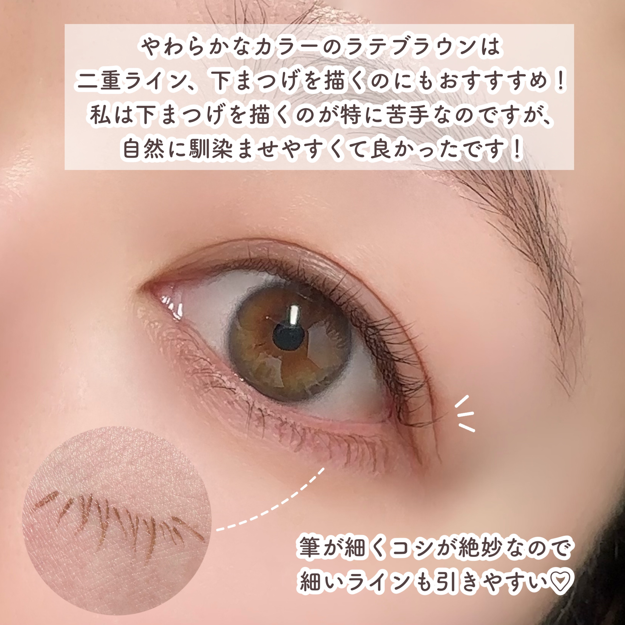 カフェラテのような柔らかなブラウン アイシャドウと馴染みながら目力出る 赤みにも黄みにもよらない絶妙カラー💗 ナチュラル仕上がりだから主張せず優しい目元に☺️ 自然に盛りたい方にオススメだよー! パーソナルカラー問わず誰にでも似合うから嬉しい😆