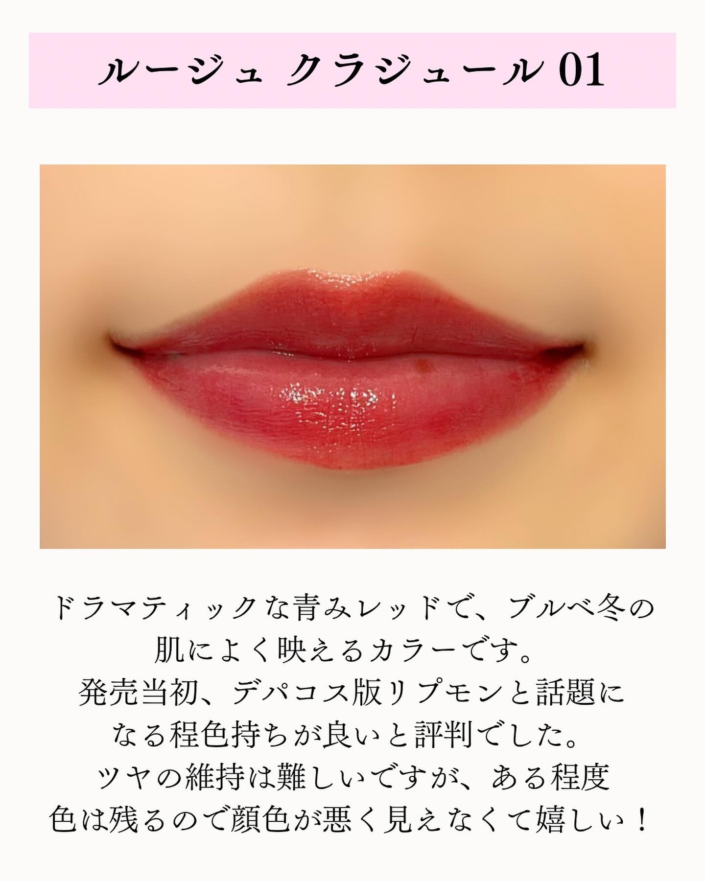 むっちむちでちゅるんとした唇に仕上がります! 色はわりとしっかりめに付くので、顔タイプフェミニン(大人顔)の私でも色が薄い!ということにはなりませんでした。 クリアウィンターの私が特にお気に入りなのは05です♡ 発色も良く、唇の縦皺も気にならないので見栄えが良い…! 診断後に何買えばいいかな?と迷っている人はこのリップを候補に入れてあげてください💄