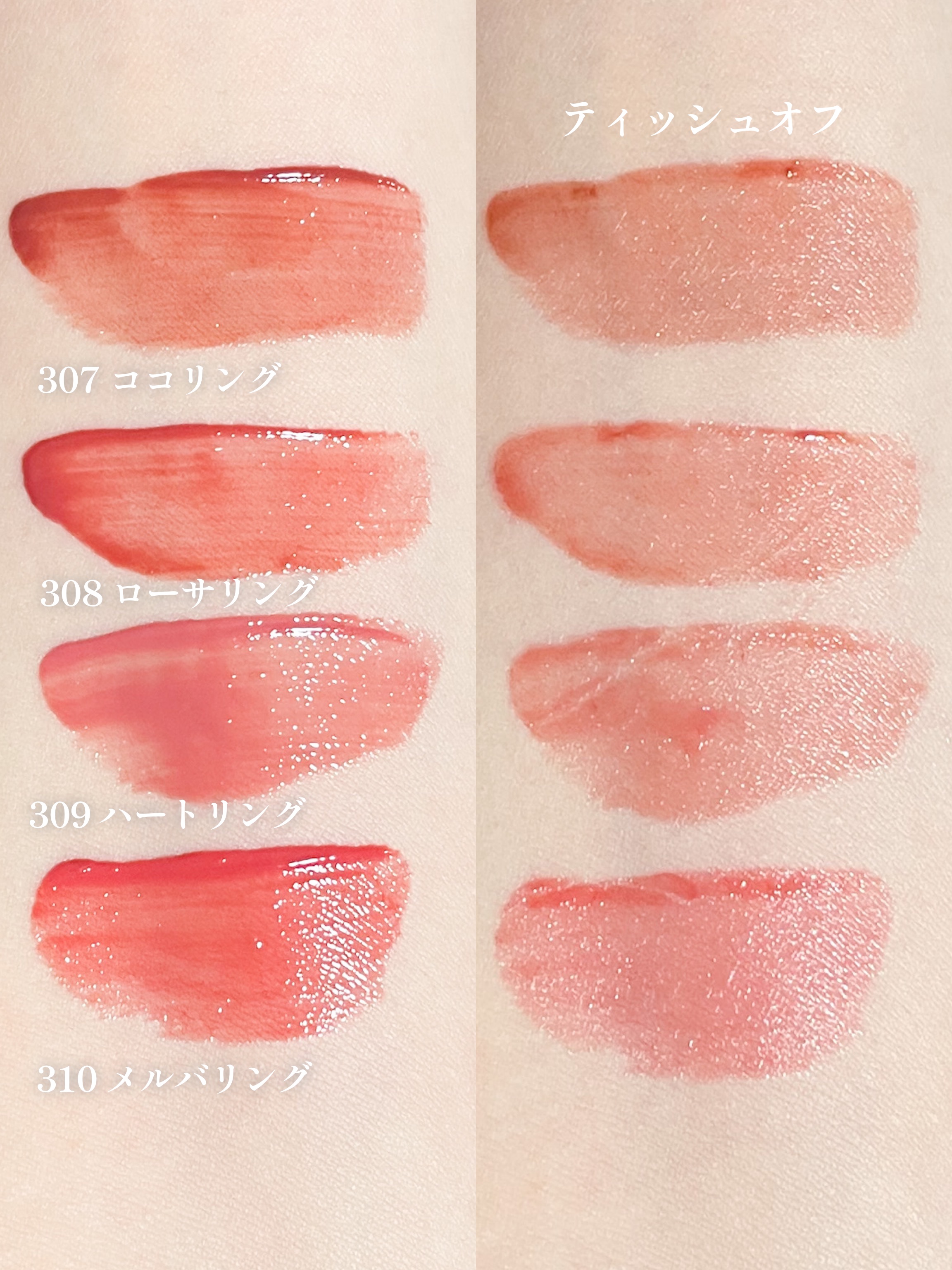 - <301 フィグリング> ジフェニルジメチコン、水、リンゴ酸ジイソステアリル、ビスジグリセリルポリアシルアジペート-2、オクチルドデカノール、水添ポリイソブテン、ダイマージリノール酸ダイマージリノレイルビス(ベヘニル/イ ソステアリル/フィトステリル)、セチルPEG/PPG-10/1ジメチコン、グリセリン、BG、イソステア リン酸ソルビタン(小麦由来)、ポリソルベート60(小麦由来)、ペンチレングリコール、(アクリル酸ヒドロキシエチル/アクリロイルジメチルタウ リンNa)コポリマー、セテアレス- 20、スクワラン、フェノキシエタノール、ステビオシド、香料、エチルヘキシルグリセリン、水酸化Al、ポリアクリル酸アンモニウム、[+/-]酸化チ タン、黄4、赤227、黄5、青1 <302 ぶどうリング> ジフェニルジメチコン、水、リンゴ酸ジイソステアリル、ビスジグリセリルポリアシルアジペート-2、オクチルドデカノール、水添ポリイソブテン、ダイマージリノール酸ダイマージリノレイルビス(ベヘニル/イ ソステアリル/フィトステリル)、セチルPEG/PPG-10/1ジメチコン、グリセリン、BG、イソステア リン酸ソルビタン(小麦由来)、ポリソルベート60(小麦由来)、ペンチレングリコール、(アクリル酸ヒドロキシエチル/アクリロイルジメチルタウ リンNa)コポリマー、セテアレス- 20、スクワラン、フェノキシエタノール、ステビオシド、香料、エチルヘキシルグリセリン、水酸化Al、ポリアクリル酸アンモニウム、[+/-]酸化チ タン、黄4、赤227、黄5、青1 <303 ももリング> ジフェニルジメチコン、水、リンゴ酸ジイソステアリル、ビスジグリセリルポリアシルアジペート-2、オクチルドデカノール、水添ポリイソブテン、ダイマージリノール酸ダイマージリノレイルビス(ベヘニル/イ ソステアリル/フィトステリル)、セチルPEG/PPG-10/1ジメチコン、グリセリン、BG、イソステア リン酸ソルビタン(小麦由来)、ポリソルベート60(小麦由来)、ペンチレングリコール、(アクリル酸ヒドロキシエチル/アクリロイルジメチルタウ リンNa)コポリマー、セテアレス- 20、スクワラン、フェノキシエタノール、ステビオシド、香料、エチルヘキシルグリセリン、水酸化Al、ポリアクリル酸アンモニウム、[+/-]酸化チ タン、黄4、赤227、黄5、青1 <304 ジンジャーリング> ジフェニルジメチコン、水、リンゴ酸ジイソステアリル、ビスジグリセリルポリアシルアジペート-2、オクチルドデカノール、水添ポリイソブテン、ダイマージリノール酸ダイマージリノレイルビス(ベヘニル/イ ソステアリル/フィトステリル)、セチルPEG/PPG-10/1ジメチコン、グリセリン、BG、イソステア リン酸ソルビタン(小麦由来)、ポリソルベート60(小麦由来)、ペンチレングリコール、(アクリル酸ヒドロキシエチル/アクリロイルジメチルタウ リンNa)コポリマー、セテアレス- 20、スクワラン、フェノキシエタノール、ステビオシド、香料、エチルヘキシルグリセリン、水酸化Al、ポリアクリル酸アンモニウム、[+/-]酸化チ タン、黄4、赤227、黄5、青1 <305 みかんリング> ジフェニルジメチコン、水、リンゴ酸ジイソステアリル、ビスジグリセリルポリアシルアジペート-2、オクチルドデカノール、水添ポリイソブテン、ダイマージリノール酸ダイマージリノレイルビス(ベヘニル/イ ソステアリル/フィトステリル)、セチルPEG/PPG-10/1ジメチコン、グリセリン、BG、イソステア リン酸ソルビタン(小麦由来)、ポリソルベート60(小麦由来)、ペンチレングリコール、(アクリル酸ヒドロキシエチル/アクリロイルジメチルタウ リンNa)コポリマー、セテアレス- 20、スクワラン、フェノキシエタノール、ステビオシド、香料、エチルヘキシルグリセリン、水酸化Al、ポリアクリル酸アンモニウム、[+/-]酸化チ タン、黄4、赤227、黄5、青1 <306 エンジェルリング> ジフェニルジメチコン、水、リンゴ酸ジイソステアリル、ビスジグリセリルポリアシルアジペート-2、オクチルドデカノール、水添ポリイソブテン、ダイマージリノール酸ダイマージリノレイルビス(ベヘニル/イ ソステアリル/フィトステリル)、セチルPEG/PPG-10/1ジメチコン、グリセリン、BG、イソステア リン酸ソルビタン(小麦由来)、ポリソルベート60(小麦由来)、ペンチレングリコール、(アクリル酸ヒドロキシエチル/アクリロイルジメチルタウ リンNa)コポリマー、セテアレス- 20、スクワラン、フェノキシエタノール、ステビオシド、香料、エチルヘキシルグリセリン、水酸化Al、ポリアクリル酸アンモニウム、[+/-]酸化チ タン、黄4、赤227、黄5、青1 <307 ココリング> ジフェニルジメチコン、水、リンゴ酸ジイソステアリル、ビスジグリセリルポリアシルアジペート-2、オクチルドデカノール、水添ポリイソブテン、ダイマージリノール酸ダイマージリノレイルビス(ベヘニル/イソステアリル/フィトステリル)、グリセリン、セチルPEG/PPG-10/1ジメチコン、BG、イソステアリン酸ソルビタン(小麦由来)、ポリソルベート60(小麦由来)、ペンチレングリコール、(アクリル酸ヒドロキシエチル/アク