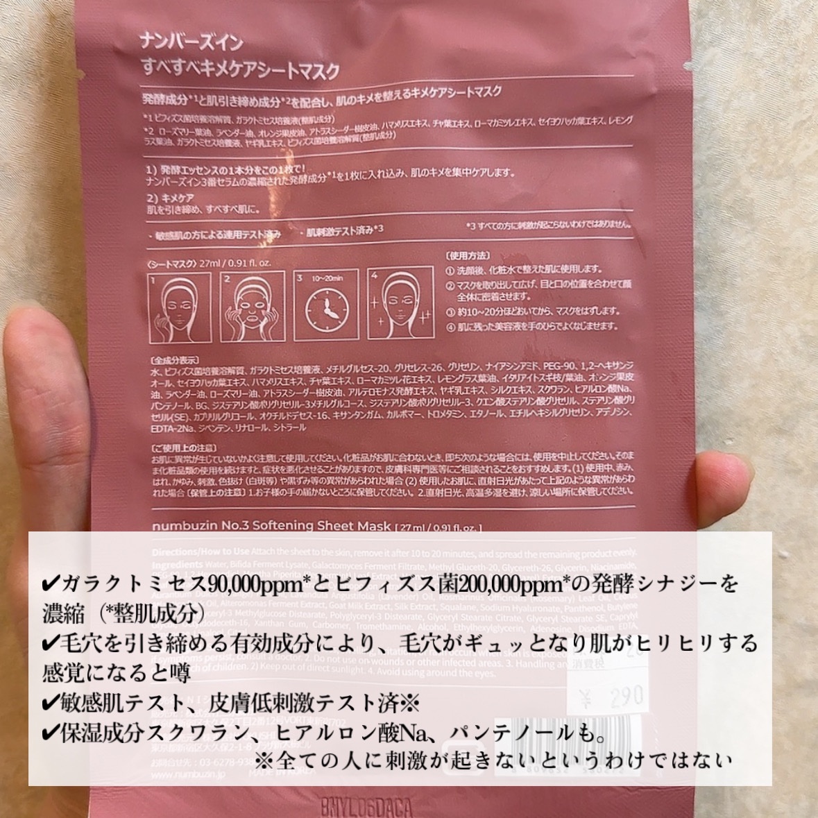 ナンバーズインの売れ筋1位の3番セラムの濃縮された発酵成分の効果を1枚にたっぷり入れ込んだパックがこちらです☺︎ ガラクトミセスとビフィズス菌の発酵シナジー成分をギュッと濃縮して入れ込みより素早く確実に肌のキメをケア ヒリヒリ感は、有効成分であるティングルポアコンプレックス™が開いた毛穴をギュッと引き締める際に現れる現象です。