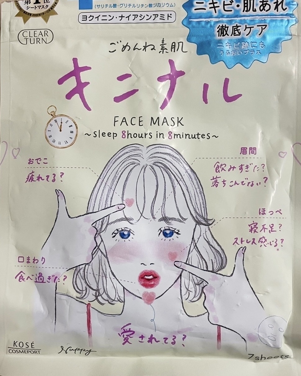 お肌が不安定な時の救世主🌟 クリアターン ごめんね素肌 キニナルマスク すぐ赤みが引いてお肌が落ち着いてくれるので、お肌がちょっとでも荒れそうな時にすぐ使っています🌟 アクネ菌を殺菌して、肌の炎症を抑えニキビを防ぎ、健やかななめらか肌に🌟