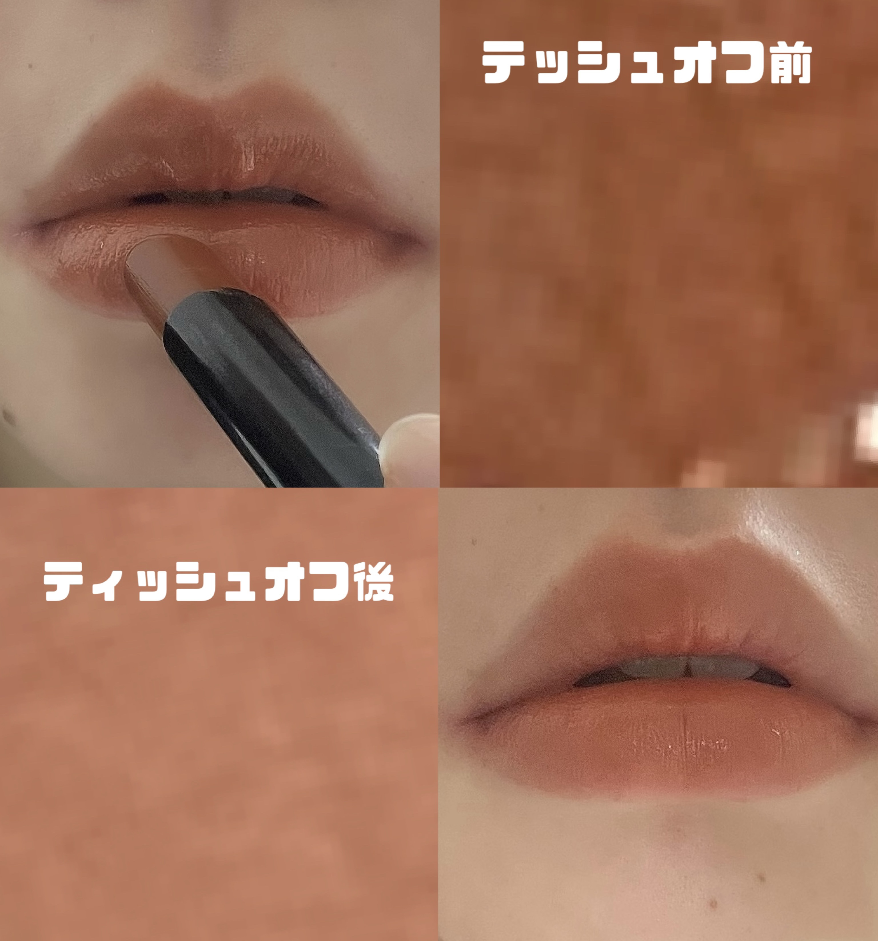 赤の強いオレンジって感じで色が目立つのでこのリップに合わせてメイクすることが多いかも👀 唇だけ変に浮くことはなくて派手だけどかわいい! ティッシュオフしても結構濃く残るからすごく助かる❤️🔥 私がリップモンスターを使う時は2色組みあわせたりすることもあるんだけど、これを使う時はEX1の焦がした茶葉の余韻を上から少し塗っても大人っぽくなって可愛かったです🫶