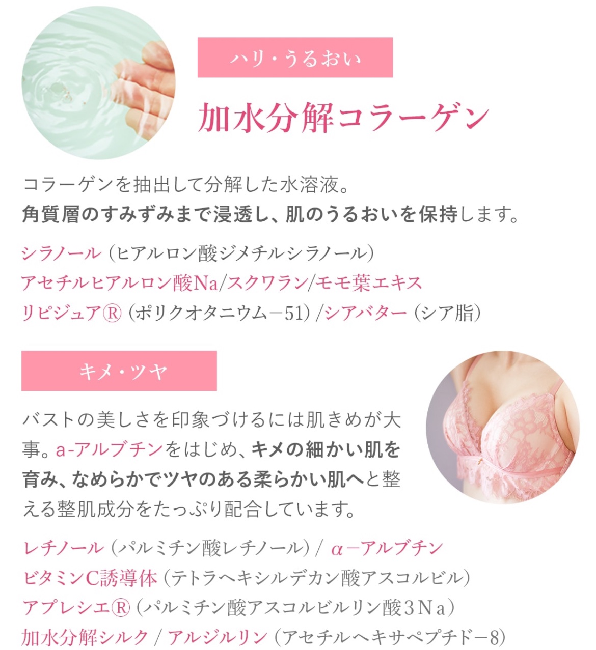 - <セダクティブフラワー> 水、イソペンチルジオール、ベタイン、グリセリン、シクロペンタシロキサン、エチルヘキサン酸セチル、シクロヘキサシロキサン、ステアリン酸グリセリル(SE)、トリメチルシロキシケイ酸、(ジメチコン/ビニルジメチコン)クロスポリマー、DPG、ハナスゲ根エキス、プエラリアミリフィカ根エキス、ダイズ種子エキス、ヒオウギエキス、α-アルブチン、プラセンタエキス、ポリクオタニウム-51、セレブロシド、スクワラン、シア脂、ピーナッツ油、アセチルヒアルロン酸Na、ヒアルロン酸Na、ヒアルロン酸ジメチルシラノール、加水分解コラーゲン、水溶性コラーゲン、シルク、シルクエキス、加水分解シルク、モモ葉エキス、豆乳発酵液、ゲットウ葉エキス、パルミチン酸レチノール、テトラヘキシルデカン酸アスコルビル、パルミチン酸アスコルビルリン酸3Na、トコフェロール、シアノコバラミン、ヨーロッパシラカバ樹皮エキス、アセチルヘキサペプチド-8、ペンタペプチド-18、BG、プロパンジオール、パンテノール、ザクロ花エキス、ダイズアミノ酸、水添レシチン、キサンタンガム、水添ポリイソブテン、カプリリルグリコール、エタノール、イソセテス-10、イソセテス-25、ソルビトール、ベヘン酸グリセリル、カルボマー、水酸化K、ベンザルコニウムクロリド、ラウリミノジプロピオン酸Na、メチルパラベン、プロピルパラベン、オクタステアリン酸ポリグリセリル-6、香料