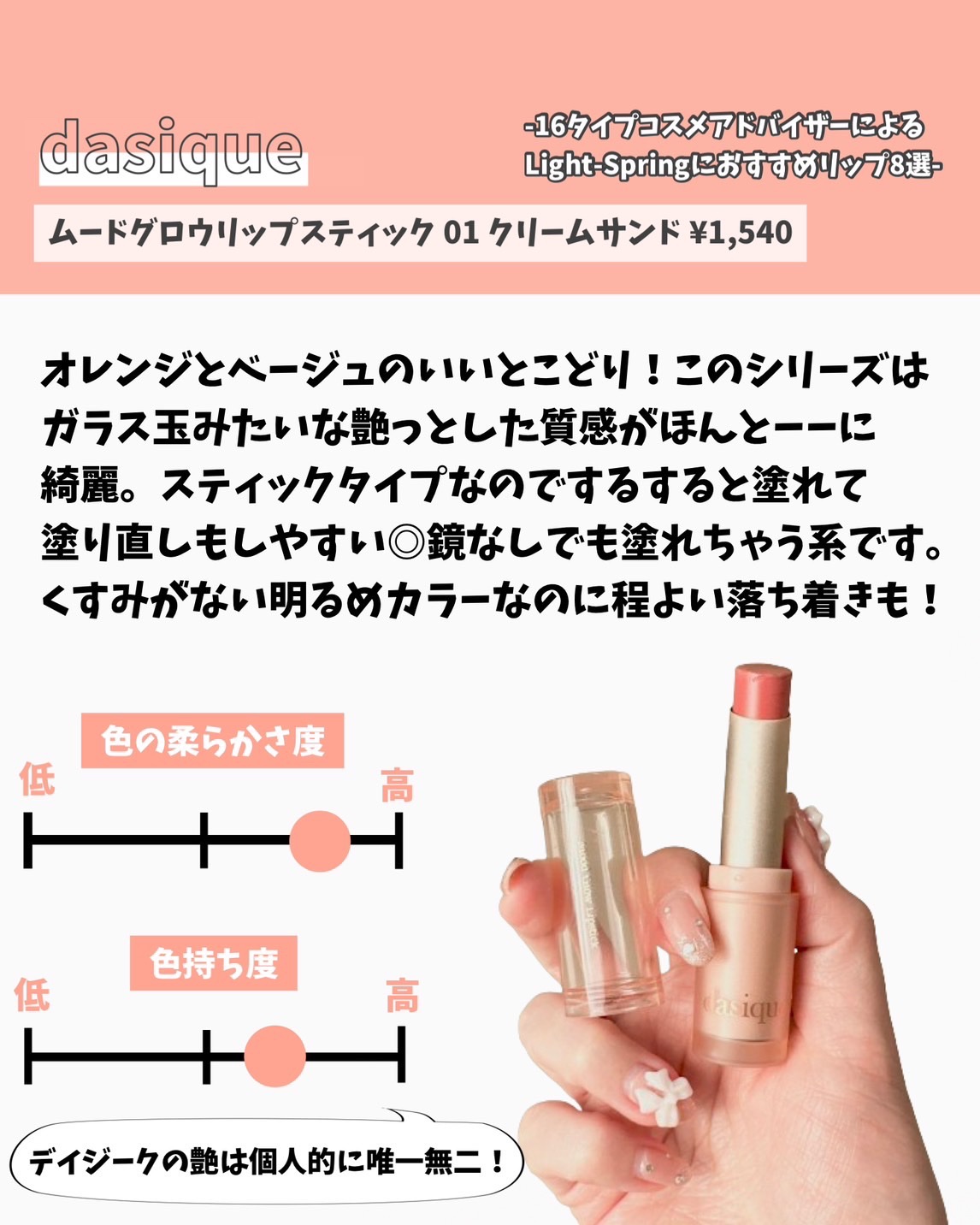 何度でも何度でも推したいそんなハイライト。濡れ艶加減は天下一品。なんとなく艶欲しいなって日も大活躍。これは余裕で底見えしそうな予感しかないけどなかなか減らない。もしかしてバーム系コスパ最強説ある。 バーム系のハイライトを使いたいけどバーム系特有のしっとり感が苦手な方におすすめ。バーム系の中では割とさらっと系。マスクメイクとも比較的相性がいい◎ 1番新入りハイライト。バーム特有の濡ツヤにしながらピンクベージュで肌馴染みも抜群。繊細パール感も綺麗。しっとり感強めなので秋冬にもぴったり。