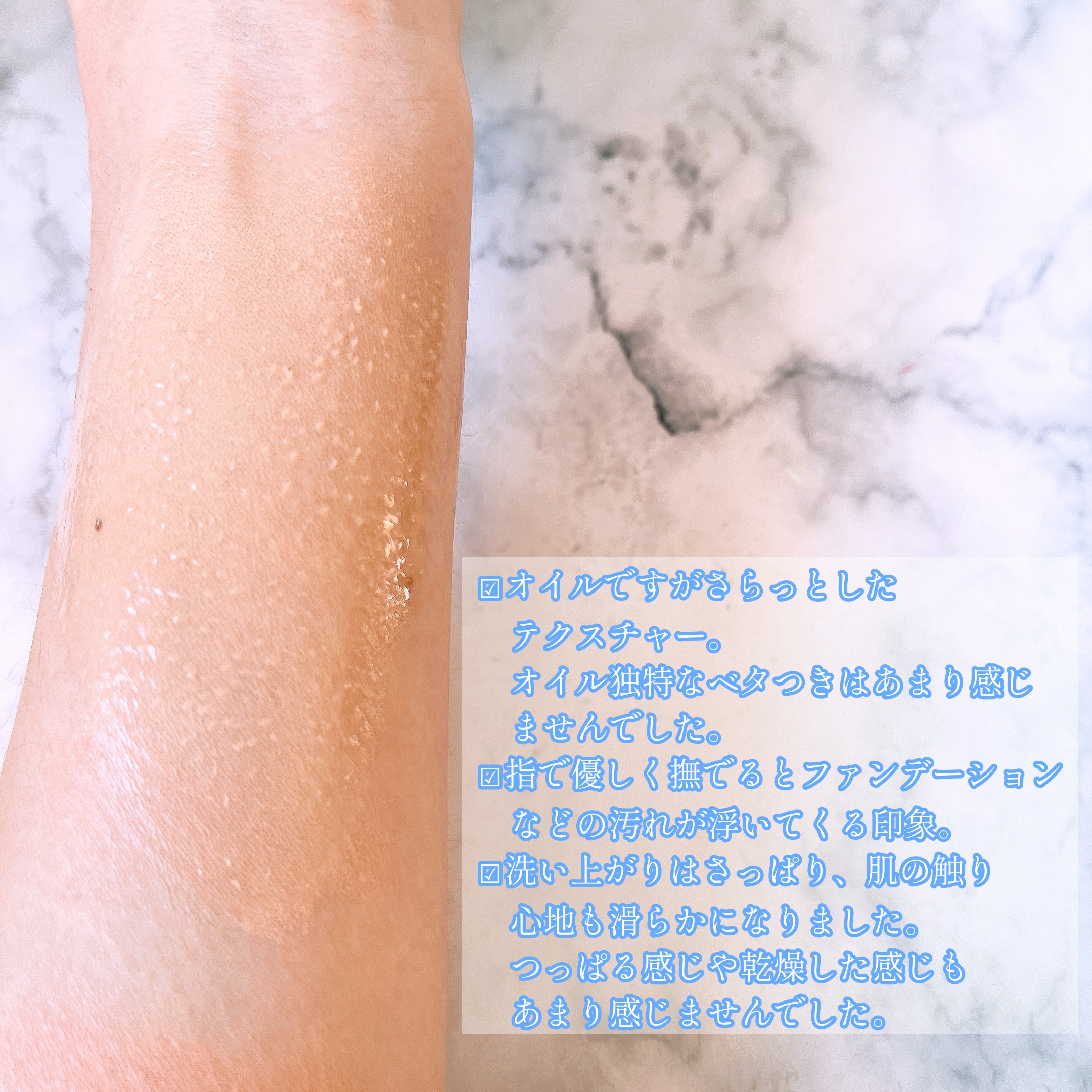 ❁バームを肌に乗せ馴染ませるように指でクルクルとすると溶けていきメイクが落ちていきます。力は不要で優しく擦るだけでアイラインやファンデーションなど綺麗に落ちていきます。 ❁オフ後の肌はさっぱりする印象。ベタつきもありませんでした。肌のつっぱりや乾燥も感じませんでした。ただ、しっとり感はあまりないかなと感じたのでオフ後、肌へのしっとり感を求める方にはやや物足りなさがあるかもしれません。 個人的にはメイクがちゃんと落ちさっぱりする方が好きなので気に入っています!