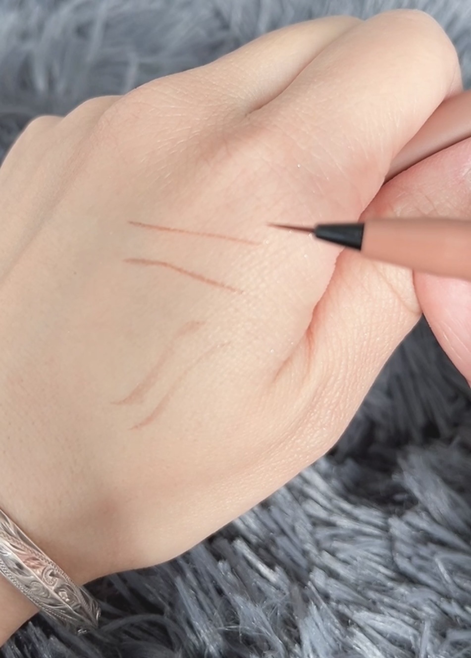 自眉のようにリアルな線で眉尻の先まで簡単に描ける、ブレにくい超極細筆😳 0.01mmの超極細ライン! 絶妙な発色で、濃すぎず薄すぎない自然な仕上がり ウォータープルーフで汗、皮脂、こすれに強く美しい仕上がりが長時間持続🥰 このライナーを使ってから朝から夜まで落ちずに綺麗な眉毛をキープできました!!😳✨