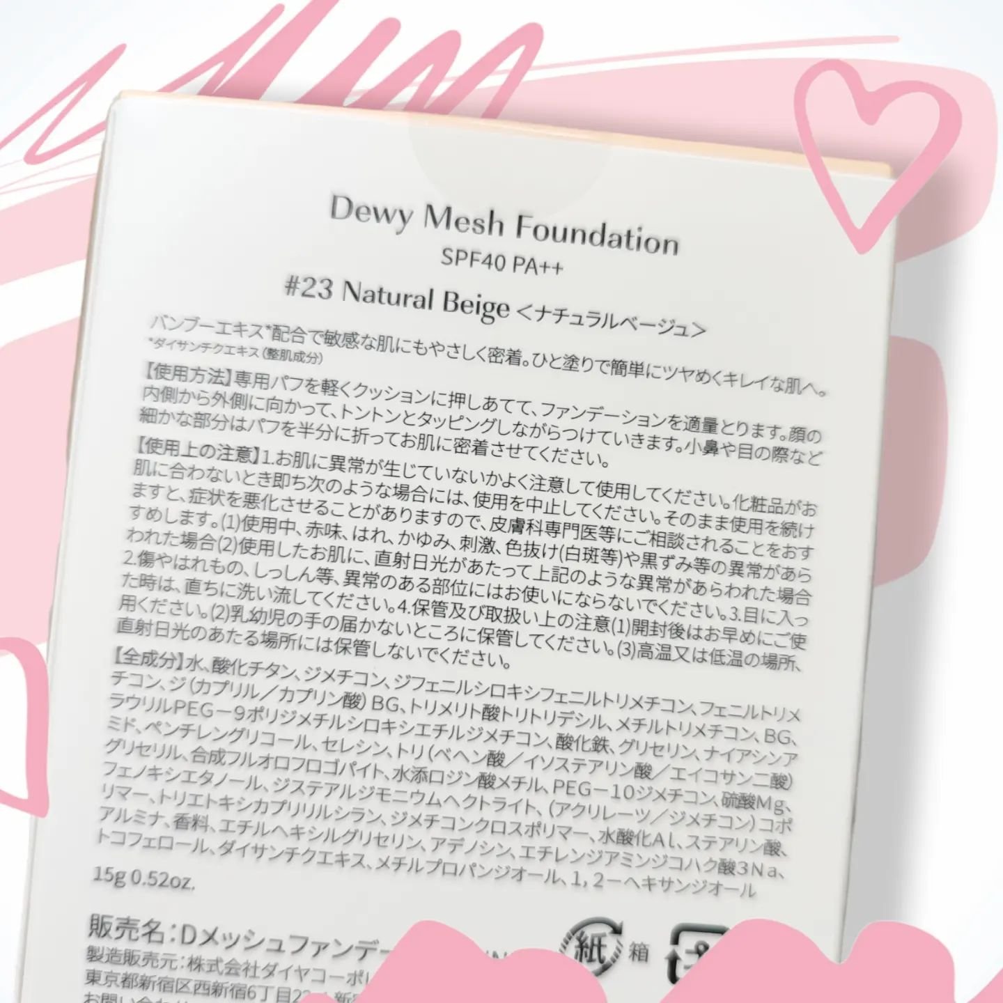 - ASUNEの新商品「デューイーメッシュファンデーション」は軽い付け心地で肌に密着し、ひと塗りで簡単にツヤめく肌を演出。 保湿成分*配合で、1日中みずみずしいフレッシュな肌に仕立てるメッシュタイプのファンデーションです。 *ナイアシンアミド、アデノシン(すべて保湿成分) ♦少量で肌に密着、簡単にナチュラルななめらか肌に 柔らかくて細かい『ミニマルジョンフォーミュラ』が肌の上に均一に分散され肌への密着力アップ。 軽い付け心地でナチュラルなのに、よれにくいなめらかな肌表現を実現。 ♦うるおい続くツヤのある輝くような肌へ 保湿成分*¹が肌に水分を与え、乾燥による化粧崩れを防止し、1日中ふっくらとしたツヤめく肌に。 ツヤあふれる肌が顔全体に透明感*²を与え、光輝く明るい印象*²に仕上げます。 *¹ナイアシンアミド、アデノシン(すべて保湿成分) *²うるおいによって肌に明るい印象をもたらすこと ♦敏感な肌に配慮した植物成分*¹配合 敏感な肌や肌荒れ*²に配慮したバンブーウォーター*¹配合。 肌の奥*³まで植物成分*¹を届けながら外部刺激*⁴から肌を守ることで、肌荒れ*²に配慮したベースメイクを実現。 *¹ダイサンチクエキス(整肌成分) *²乾燥などによる *³角質層 *⁴紫外線や乾燥など ♦テクスチャー 軽い付け心地でスッと肌に馴染みナチュラルなツヤ感を演出。みずみずしいフレッシュな肌に仕立てます。 【使用方法】 1.専用パフを軽くクッションに押しあてて、ファンデーションを適量とります。 2.顔の内側から外側に向かって、トントンとタッピングしながらつけていきます。 3.小鼻や目の際など細かな部分はパフを半分に折って肌に密着させてください。 【こんな方におすすめ】 軽い付け心地が好きな方/ツヤ肌に仕上げたい方/乾燥が気になる方/敏感肌の方* *乾燥などによる 【主要成分】 〈ダイサンチクエキス*¹〉 外的刺激*²を受けた敏感な肌をすこやかに保ちます。 *¹整肌成分 *²紫外線や乾燥など 〈アデノシン(保湿成分)〉 肌へスッと浸透*¹し、保湿とエイジングケア*²をサポートしハリのあるうるおった肌に仕上げます。 *¹角質層まで *²年齢に応じたお手入れ 〈ナイアシンアミド(保湿成分)〉 肌をすこやかに整え、うるおいをチャージしてくれるナイアシンアミド*¹が 明るく*²しっとりとしたなめらかな肌に整えます。 *¹保湿成分 *²うるおいによって肌に明るい印象をもたらすこと