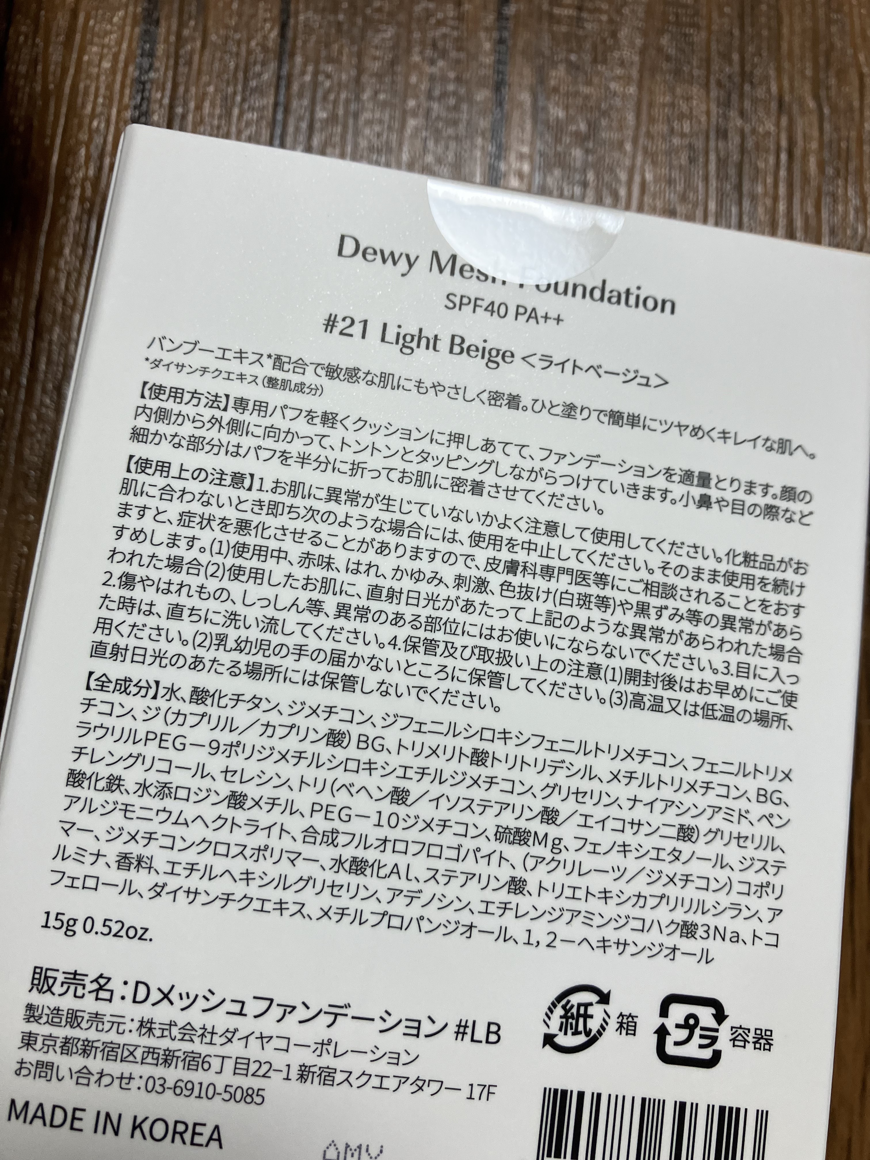 - <#21 ライトベージュ> 水、酸化チタン、ジメチコン、ジフェニルシロキシフェニルトリメチコン、フェニルトリメチコン、ジ(カプリル/カプリン酸)BG、トリメリト酸トリトリデシル、メチルトリメチコン、BG、ラウリルPEG-9ポリジメチルシロキシエチルジメチコン、グリセリン、ナイアシンアミド、ペンチレングリコール、セレシン、トリ(ベヘン酸/イソステアリン酸/エイコサン二酸)グリセリル、酸化鉄、水添ロジン酸メチル、PEG-10ジメチコン、硫酸Mg、フェノキシエタノール、ジステアルジモニウムヘクトライト、合成フルオロフロゴパイト、(アクリレーツ/ジメチコン)コポリマー、ジメチコンクロスポリマー、水酸化Al、ステアリン酸、トリエトキシカプリリルシラン、アルミナ、香料、エチルヘキシルグリセリン、アデノシン、エチレンジアミンジコハク酸3Na、トコフェロール、ダイサンチクエキス、メチルプロパンジオール、1,2-ヘキサンジオール <#23 ナチュラルベージュ> 水、酸化チタン、ジメチコン、ジフェニルシロキシフェニルトリメチコン、フェニルトリメチコン、ジ(カプリル/カプリン酸)BG、トリメリト酸トリトリデシル、メチルトリメチコン、BG、ラウリルPEG-9ポリジメチルシロキシエチルジメチコン、酸化鉄、グリセリン、ナイアシンアミド、ペンチレングリコール、セレシン、トリ(ベヘン酸/イソステアリン酸/エイコサン二酸)グリセリル、合成フルオロフロゴパイト、水添ロジン酸メチル、PEG-10ジメチコン、硫酸Mg、フェノキシエタノール、ジステアルジモニウムヘクトライト、(アクリレーツ/ジメチコン)コポリマー、トリエトキシカプリリルシラン、ジメチコンクロスポリマー、水酸化Al、ステアリン酸、アルミナ、香料、エチルヘキシルグリセリン、アデノシン、エチレンジアミンジコハク酸3Na、トコフェロール、ダイサンチクエキス、メチルプロパンジオール、1,2-ヘキサンジオール