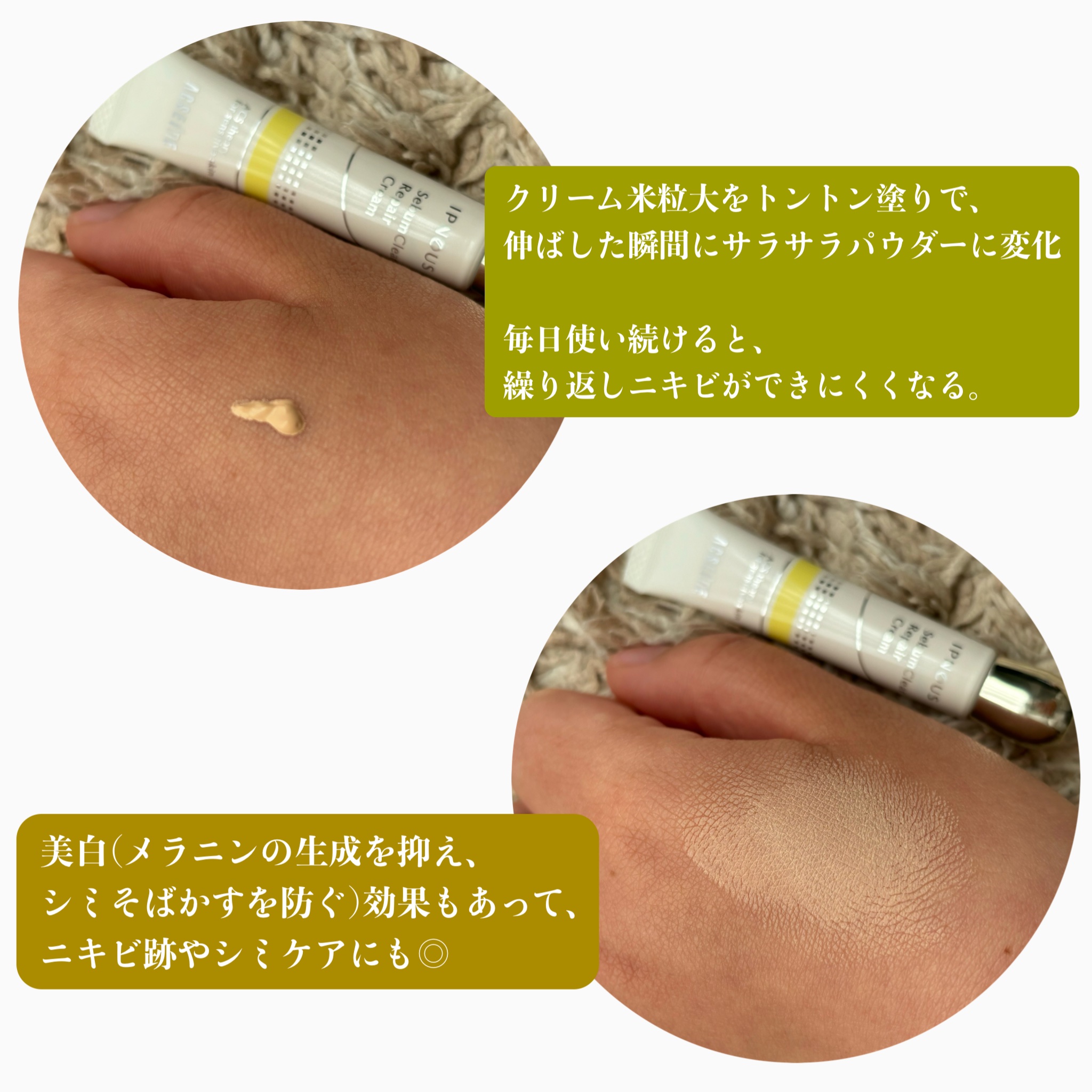 ニキビ跡・色ムラを事前にカバー。 ニキビ・肌荒れを未然に防ぐ、薬用リペアクリーム。 クリームがパウダーに変化し、赤み・ニキビ跡・色ムラの気にならない、サラサラで明るい肌に仕上げます。 隠しながらケアできる「日中ニキビケア」🥹 とても画期的で使いやすくて欠かせないアイテムです!