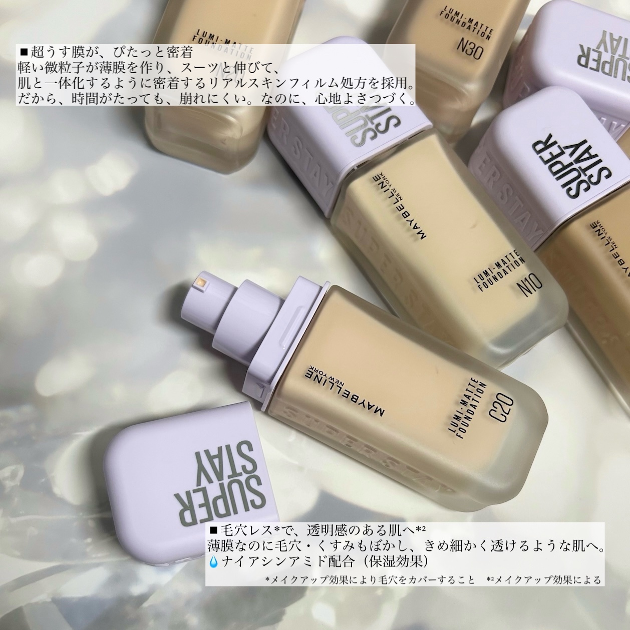 - 超うす膜なのに、崩れにくい。 全瞬間ビジュがいい。 1. 超うす膜が、ぴたっと密着 軽い微粒子が薄膜を作り、スーッと伸びて肌と一体化するように密着する、 「リアルスキンフィルム処方」を採用。 だから、時間がたっても、崩れにくい。 なのに、心地よさつづく。 2.毛穴レス*1で、透明感のある肌*2 薄膜なのに毛穴・くすみはぼかし、きめ細かく透けるような肌*1へ。 「ナイアシンアミド配合」*3 全6色展開 *1メイクアップ効果により毛穴をカバーすること *2メイクアップ効果による *3保湿効果 ※2026年2月10日〜パッケージリニューアル