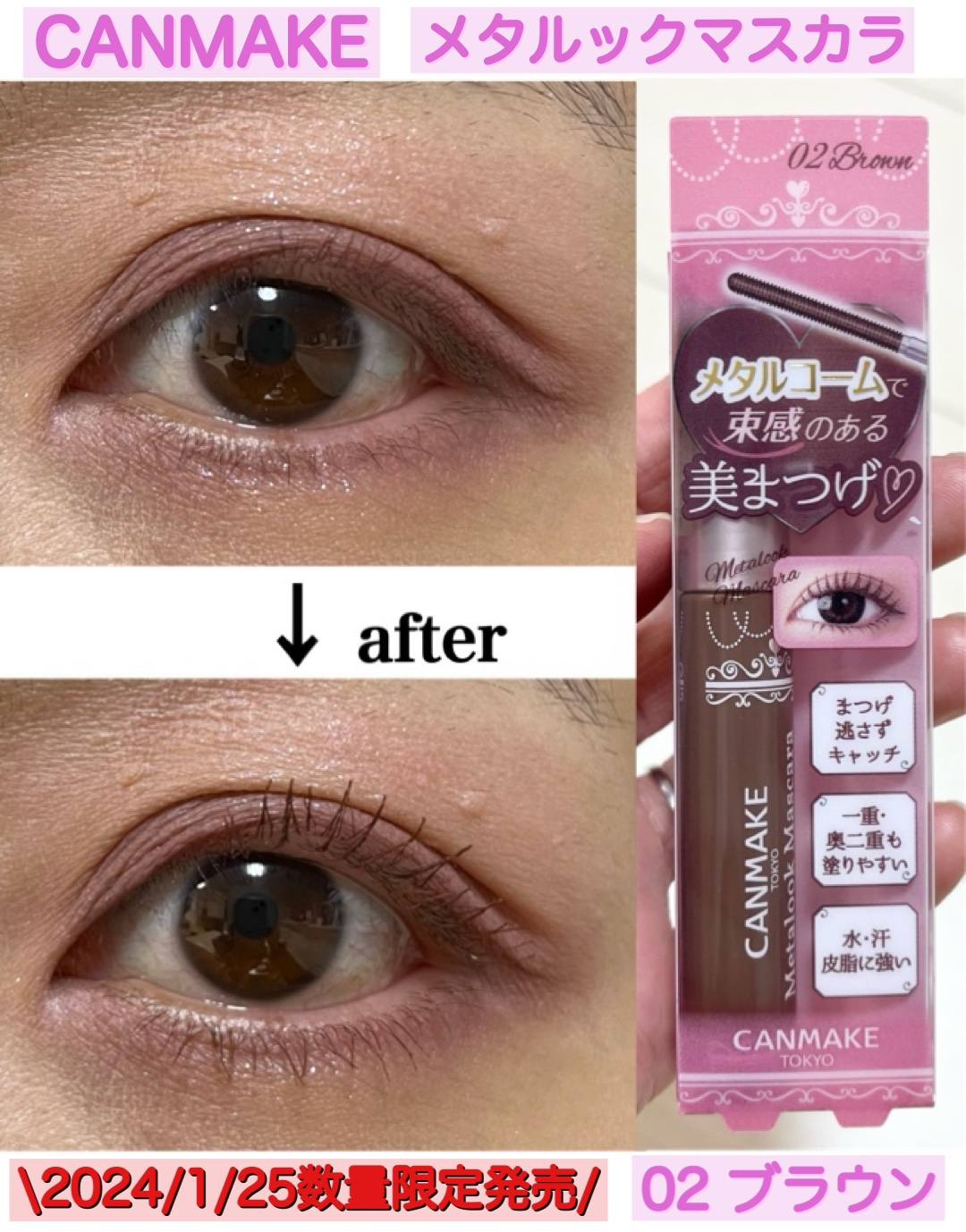 - 01 ブラックは2024年4月以降順次定番化! メタルコームが塗りやすい♡ 自分好みの束感がつくれるマスカラ 流行りの束感まつげ、今日はどのルックにする? ♡繊細な束感をつくるための極細メタルコーム 束感のあるまつげをつくるために設計された均一なピッチが、 程よく数本のまつげを束ねます。 届きにくい目頭や目尻のまつげも塗りやすい! ♡重ね塗りで自分好みの束感に なめらかな液がまつげに均一につくので、 重ね塗りをしてもダマになりにくい! 繊細でナチュラルな束感~盛り束感まで、これ1本で自由自在♪