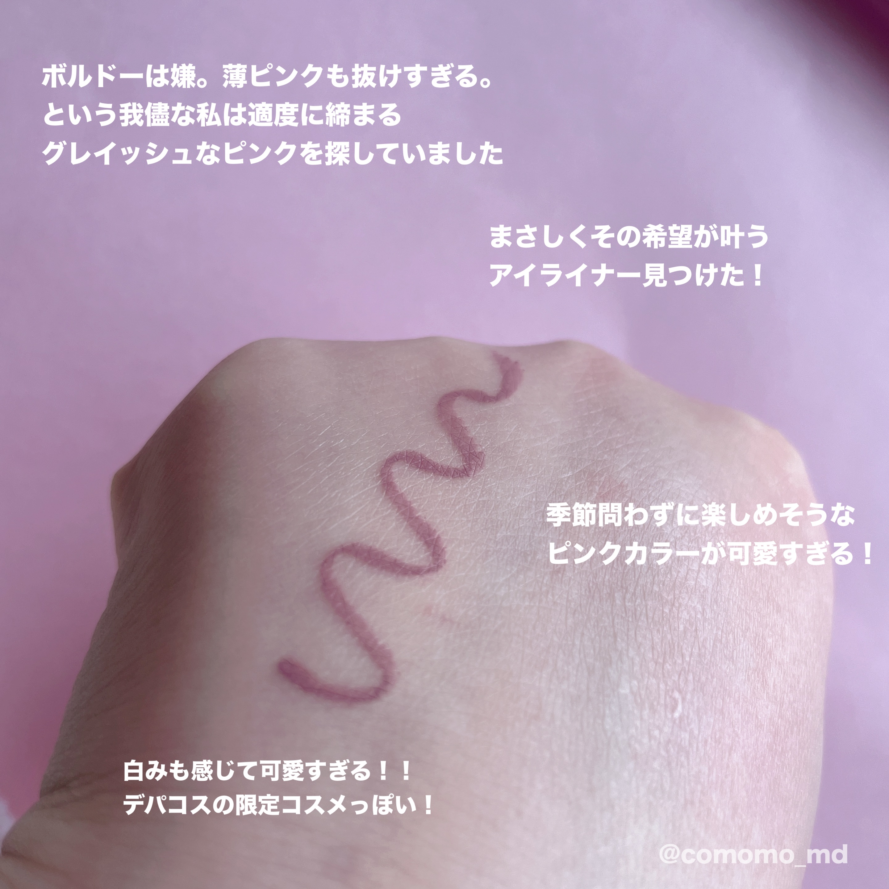 私が購入したのは003のピンクカラーです。 これ、公式インスタで7月に見かけてからずーーーーーっと気になってました。 ニュートラルなベビーピンク。 薄く淡い見た目で桜カラーと呼んでも良さそう。 時間経過しても残ってるのはピンクでした。 パール感はやはり8時間外出×マスク×化粧直しなしのズボラ日では薄まってましたが、許容範囲。
