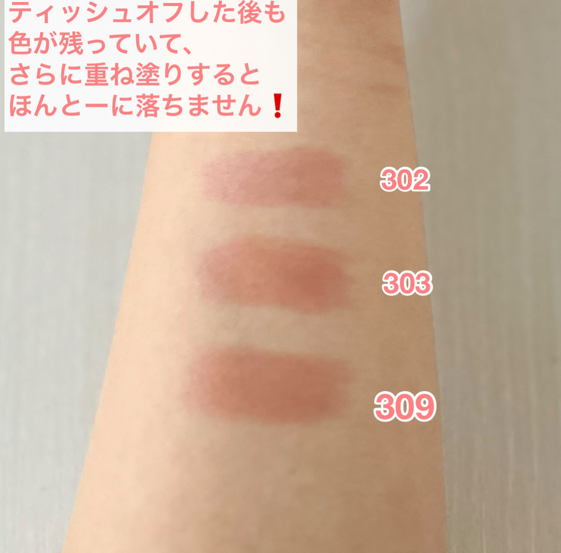 このカラーは、 ブルベさんに人気のカラーですが、 私の口に塗ると、 そこまで青みが強くないと感じました! 色味は、 ピンクよりの赤という高発色な感じで、 一度で一気に塗るよりも、 グラデーションにして使うのがおすすめです!♡ それと、 ピンクメイクとの相性が抜群です!! チェリーみたいな甘い香りがするのも、 好きなポイントです!! ぜひチェックしてみてください♡
