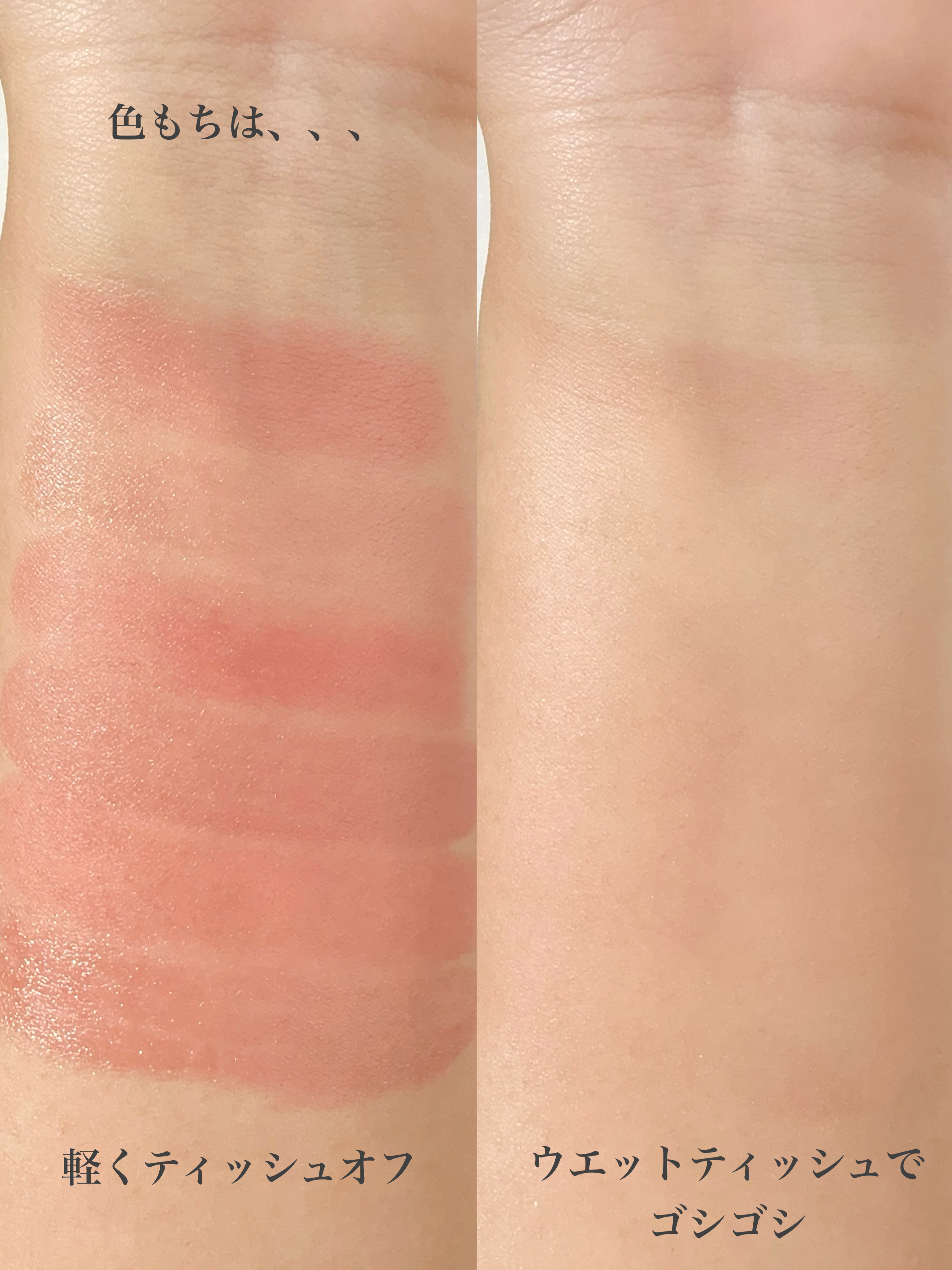 ねっちょりボリューム感あるテクスチャーだけど、ベタつきなく使いやすい。 ティントじゃない普通のグロスだから色もちは良くない。 発色ナチュラルだからこれだけでもいいけど、他のリップと合わせても可愛い!!