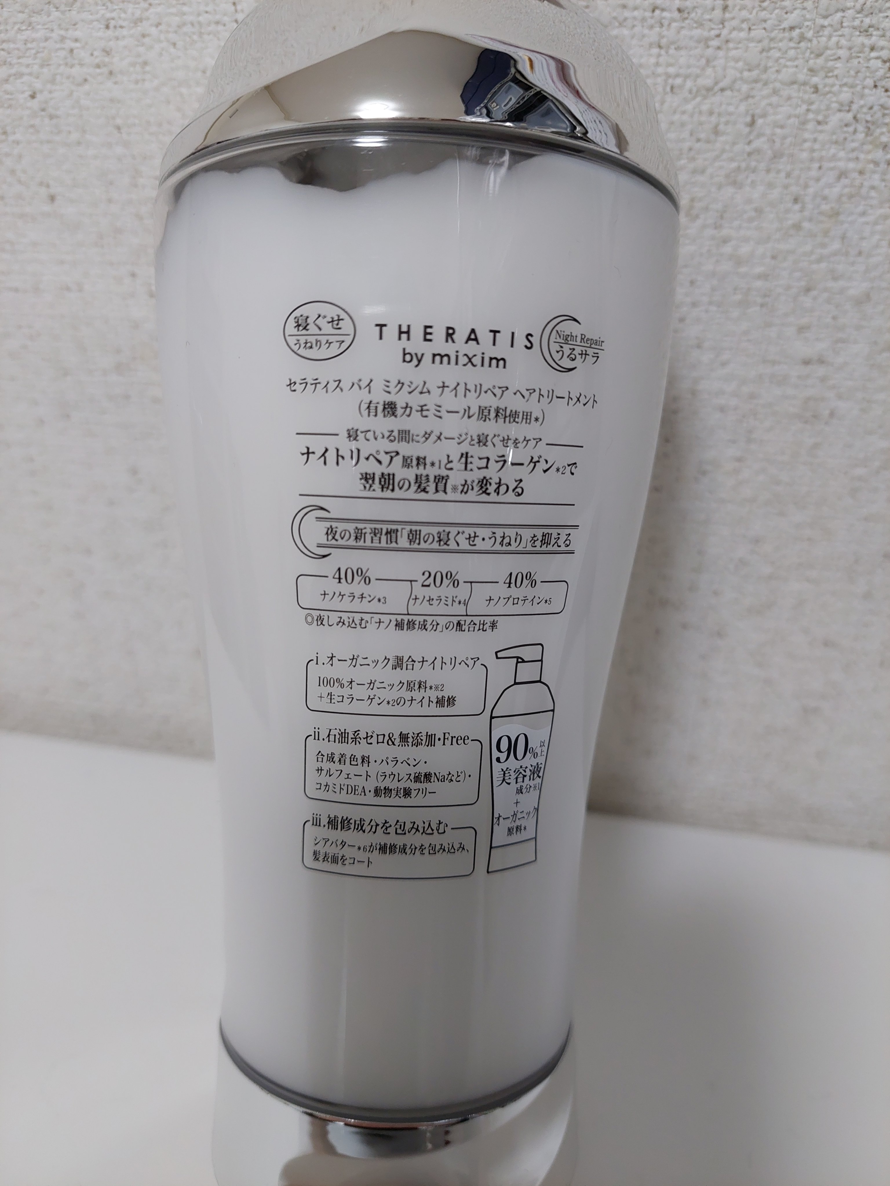 THERATISbymiximナイトリペアシャンプー/ヘアトリートメントを使用しました😊寝ている間に補修成分がしみ込み、うねり・寝ぐせを抑制する新ナイトリペアヘアケアアイテムです。90%以上が美容液成分配合。石油系界面活性剤・合成着色料・ラウ...