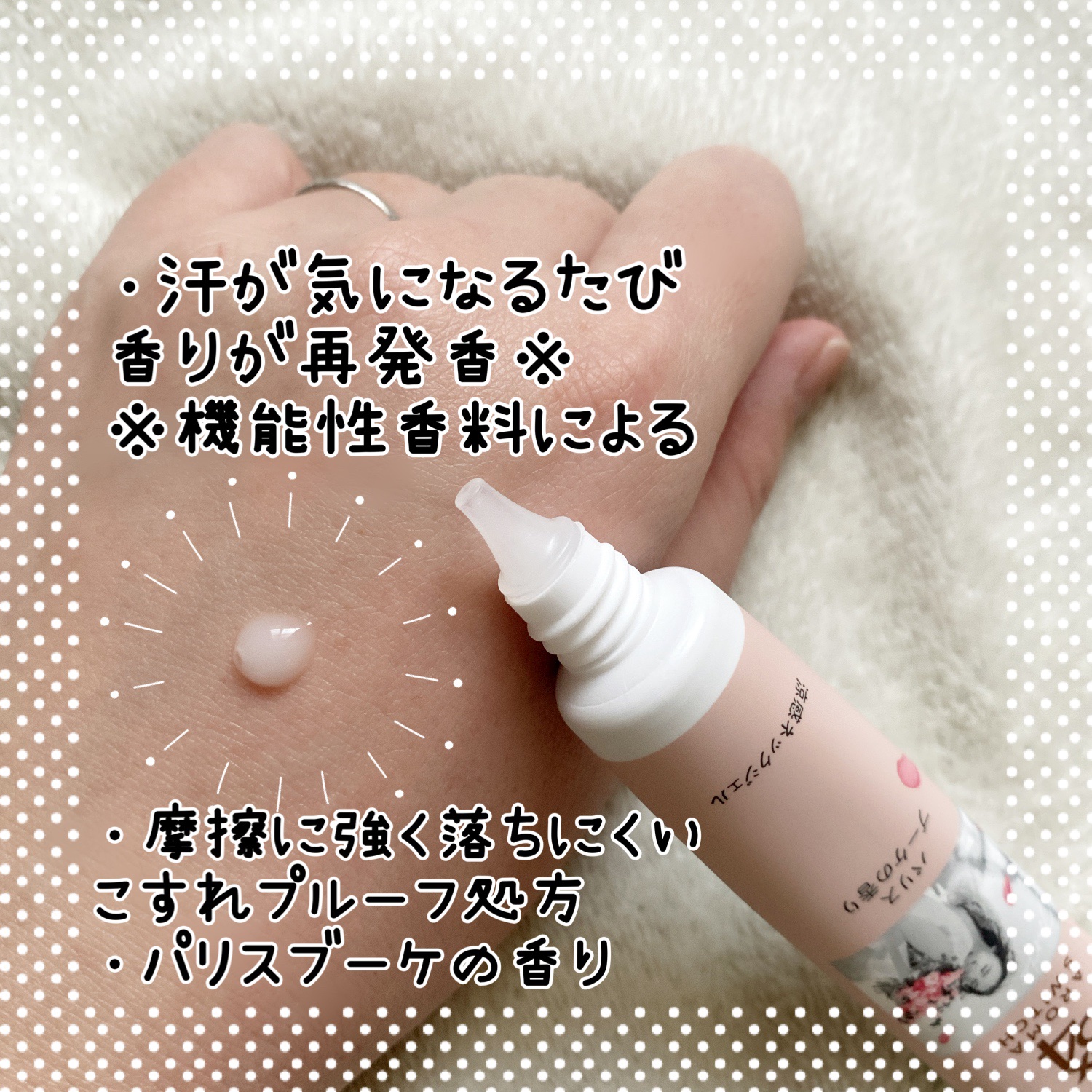 - 首のベタつきを抑え、髪の張り付きを防ぎます 汗が気になるたび、新鮮な香りがはじけてさらっと涼やか ●ジェルが肌をまもって整えます ●汗吸収さらさらパウダー(基剤)配合 肌になじんでドライベールをつくり、さらっと汗を乾かし続けます ●冷涼成分(冷感剤)配合 汗に反応して、ひんやりします ●汗が気になるたび香りが再発香(*2) 汗が気になるたび、新鮮な香りがはじけてあなたを包みます (*2)機能性香料によるカバーリング効果 ●摩擦に強く落ちにくいこすれプルーフ処方 ●携帯に便利なサイズ。約50回使えます ●海外の都市やシーンをイメージした3種類の香り いずれもエッセンシャルオイル配合(香料中)。 パリスブーケの香り:みずみずしいピオニーにペア一の甘さをプラス。大切な人から花束をもらった幸せな瞬間をイメージした香り