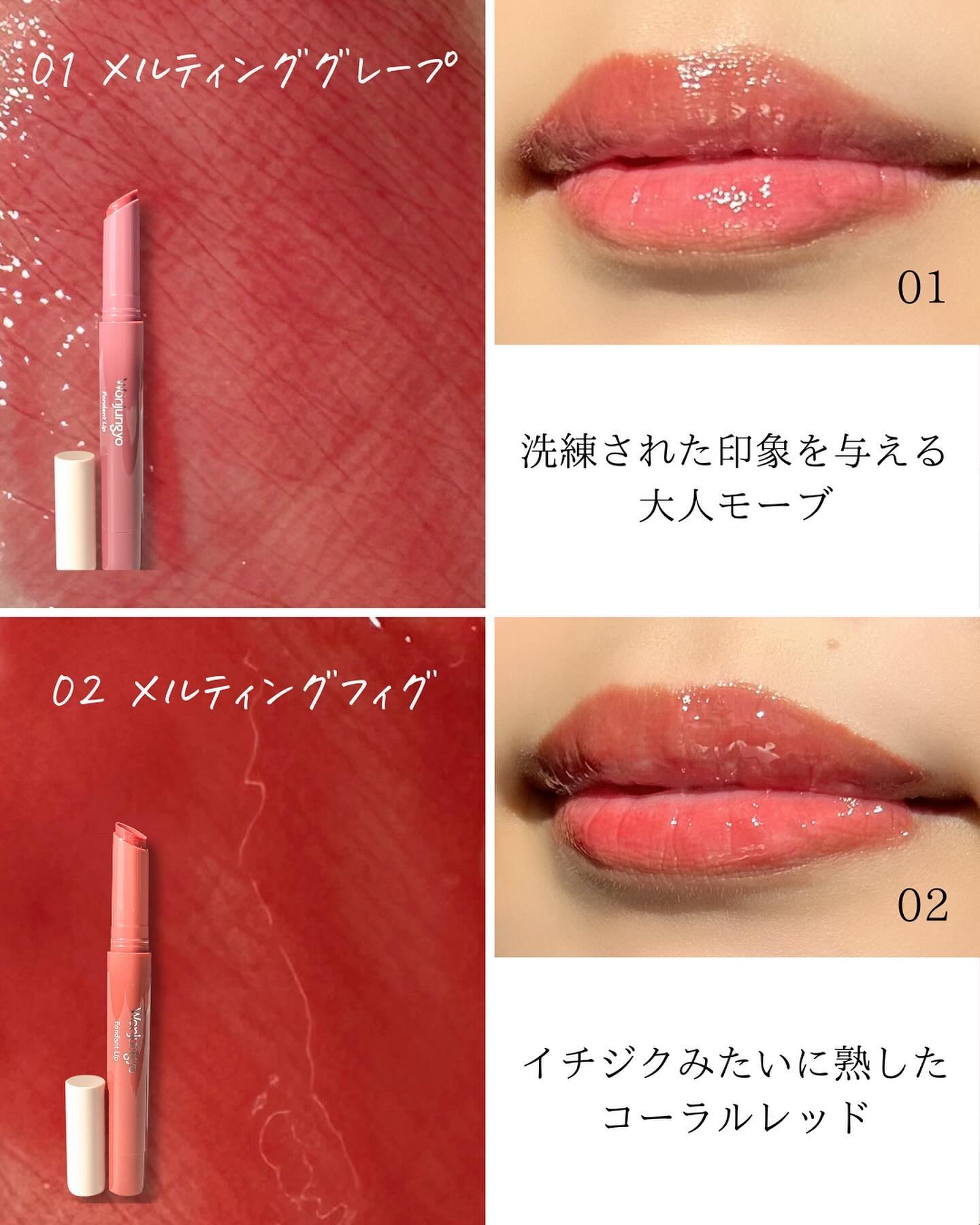 - <01 メルティンググレープ> リンゴ酸ジイソステアリル、ダイマージリノール酸ダイマージリノレイルビス(ベヘニル/イソステアリル/フィトステリル)、ビスジグリセリルポリアシルアジペート-2、トリイソステアリン酸ポリグリセリル-2、合成ワックス、水添ポリイソブテン、テトライソステアリン酸ペンタエリスリチル、セチルPEG/PPG-10/1ジメチコン、1,2-ヘキサンジオール、イソステアリン酸ソルビタン、酸化チタン、ジステアルジモニウムヘクトライト、酸化鉄、赤202、(エチレン/プロピレン)コポリマー、炭酸プロピレン、青1、香料、リモネン、黄5、リナロール、黄4、水、テトラ(ジ-t-ブチルヒドロキシヒドロケイヒ酸)ペンタエリスリチル、BG、モモ果実エキス、ビルベリー果実エキス、ウンシュウミカン果皮エキス、フェノキシエタノール、エチルヘキシルグリセリン <02 メルティングフィグ> リンゴ酸ジイソステアリル、ダイマージリノール酸ダイマージリノレイルビス(ベヘニル/イソステアリル/フィトステリル)、ビスジグリセリルポリアシルアジペート-2、トリイソステアリン酸ポリグリセリル-2、合成ワックス、水添ポリイソブテン、テトライソステアリン酸ペンタエリスリチル、セチルPEG/PPG-10/1ジメチコン、1,2-ヘキサンジオール、イソステアリン酸ソルビタン、ジステアルジモニウムヘクトライト、酸化チタン、黄5、赤202、(エチレン/プロピレン)コポリマー、炭酸プロピレン、酸化鉄、香料、リモネン、リナロール、黄4、水、テトラ(ジ-t-ブチルヒドロキシヒドロケイヒ酸)ペンタエリスリチル、BG、モモ果実エキス、ビルベリー果実エキス、ウンシュウミカン果皮エキス、フェノキシエタノール、エチルヘキシルグリセリン