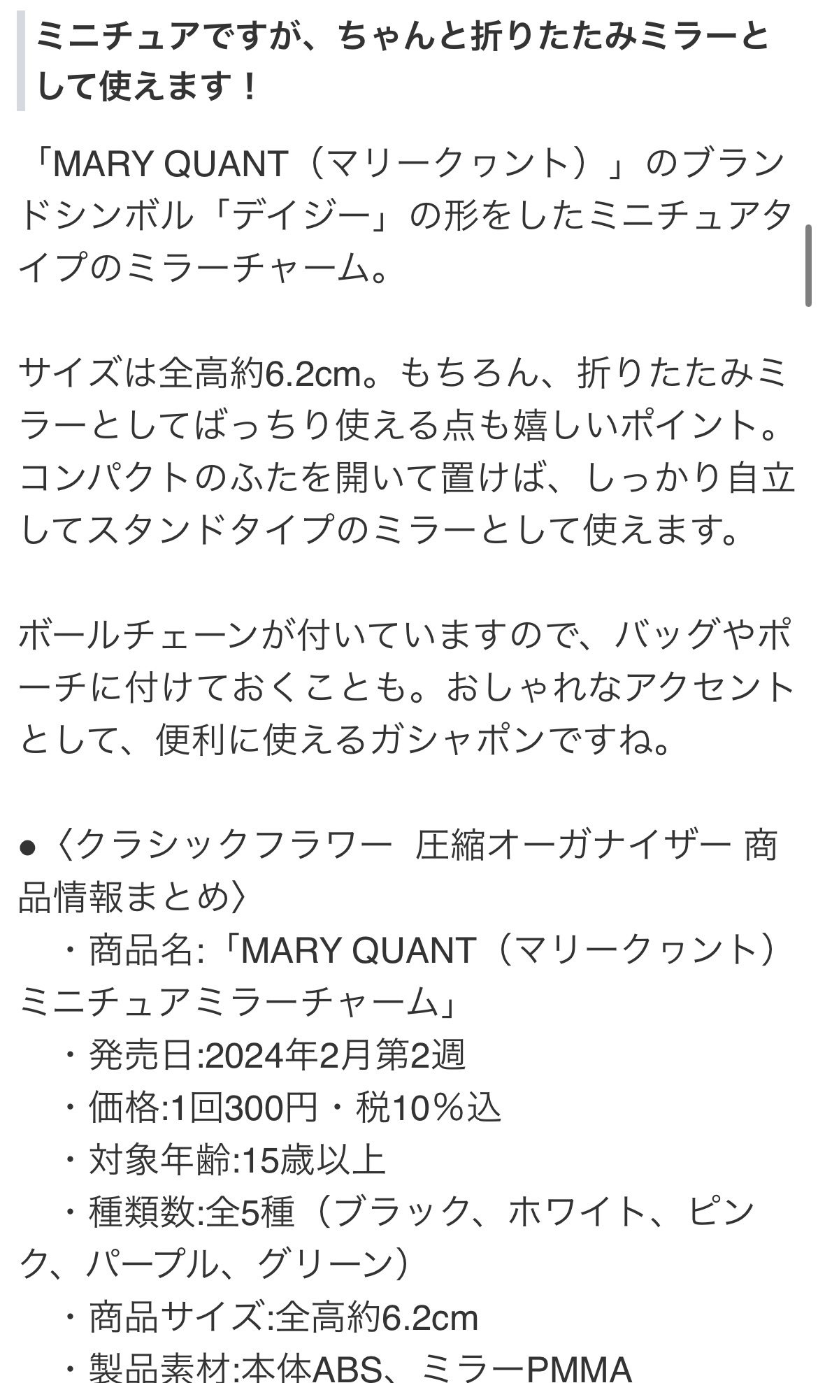 お花のマークでお馴染みのコスメ マリークヮント。通称マリクワ。 あのマリクワからミラーがガシャポンで登場。 2024年2月第2週目から。 300円でゲット その上ミラーはガチで使える超絶お得🉐 マリクワファンなら朗報でございます。 ミラーとしてもポーチのキーホルダーとしても 外出先に一役買いそうな予感であります。 ──────────── マリークヮント マリクワのコスメは昭和45年に日本に上陸。2027年で発売55周年を迎えます。 大元は、サロンドフルベール(旧フルベール化粧品)、クラブホルモンクリームでお馴染みのクラブコスメチックス。 クラブコスメチックスは兵庫県神戸市発祥の老舗化粧品メーカーの中山太陽堂からスタート。 粉洗顔と白粉で人気を経てホルモンクリームなど現在でも根強く人気になり昭和45年にイギリスのガラスコスメチックスと提携を結びマリークヮントコスメチックスが設立されマリークヮントが日本に上陸。 翌年、中山太陽堂がクラブコスメチックスに商号変更されその翌年には現在のサロンドフルベールの前身であるフルベール化粧品が子会社として設立。 平成21年にフルベール化粧品はサロンドフルベールに商号変更。フルベール化粧品は当時は訪問販売一本でやっていましたが、訪問販売によるクレーム、トラブルが相次ぎ売り上げが激減し、販売方法などに問題があるとの理由もあり各訪問販売化粧品メーカーは自社サロンを設けるか代理店契約を結び代理店販売に変更された事によりフルベール化粧品は自社サロン、代理店販売にシフトされた事によりサロンドフルベールに変更。平成24年にクラブコスメチックスと合併。 現在は、コンシューマー向けがクラブコスメチックス、サロン並びに代理店経由ではサロンドフルベール、デパート、ブティク、ショップ経由がマリークヮント、一部ドラッグストア、GMS、バラエティショップ向けにデイジードールラインが発売されています。 マリークヮントコスメチックスは、90年代前半にティーンの間で人気となり、スキンケア、メイクアップが人気に。 特にメイクアップは、カスタマイズ出来て色数豊富な為高くても物凄い人気となり、ティーン向け雑誌にも載る程でありました。 アパレルも展開している為アパレルと一緒に購入するファンも多かった事。 便宜上デパコスになりますが、デパコスといえどもカウンター形式での販売ではなくマリークヮントブティクやマリークヮントショップでの販売方式となっております。 マリークヮントも値段が高いのと取り扱いショップが少ないとの声もありお値段を下げてGMSやドラッグストア、バラエティショップでも手軽に購入できるように妹ブランド=セカンドブランドのデイジードールラインが展開され、マリークヮントからデイジードールに移行したり、デイジードールから入って本家マリークヮントを購入といったファンも少なからず存在。 中には90年代当時マリークヮントを使われていた女子高生や女子大生の方たちは現在50代から40代後半になり親子2代で使われている方たちも多いブランドでございます。 当時を知る方たちは大変懐かしく感じるブランド。 現在も堅実に販売されております。 記事はLIFE &MONEY LIMOより #マリークヮント#ガチャガチャ#キーホルダー#バンダイ