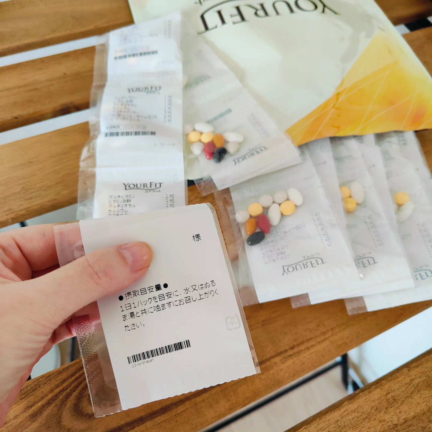 簡単なアンケートに答えていくだけで、自分の栄養状態(なにが不足してる・なにを摂取し過ぎてる)を分析して1人1人違うサプリメントを組み合わせてオリジナルのものを紹介してくれます。 実際に届いたものは1日分ずつ包装されているので、数種類飲むのに手軽で時短でした! サプリを数種類飲むときに、いくつもボトルやパウチを開け締めするのは面倒だったので「YOURFIT」は良かったです😊 1つ1つの効能が詳しく説明されていたり、アンケートに基づいた生活習慣や食についてのアドバイスもしてくれるのが勉強になりました。