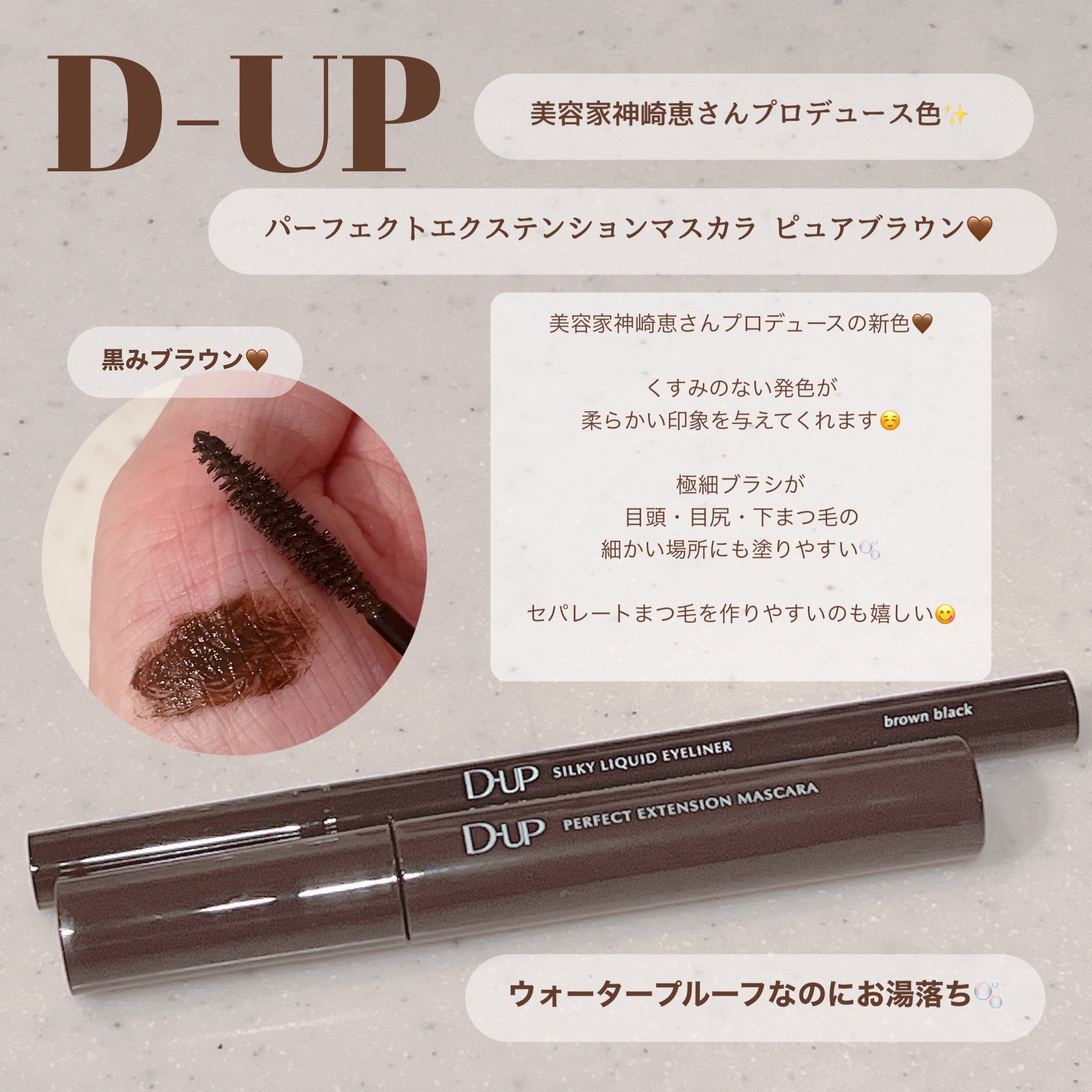 絶妙なブラウンカラーがおしゃれなD-UPさんのマスカラとアイライナー👀💓どんなメイクとも合わせやすくてお気に入りでヘビロテしてるよ🎀✨✔️パーフェクトエクステンションマスカラ🎨ピュアブラウン神崎恵さんプロデュースカラーのピュアブラウン🤎つ...