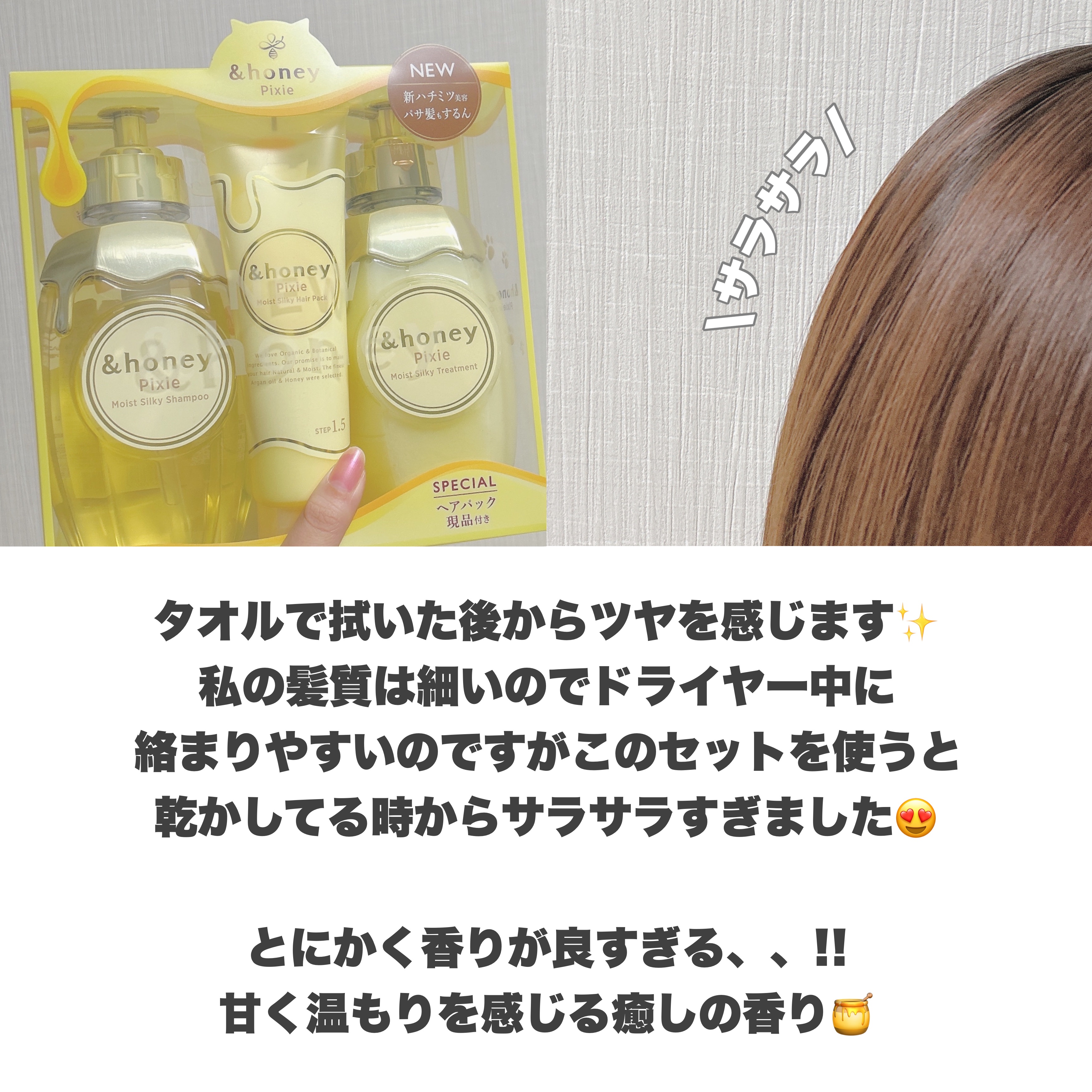 パサつきや絡まりをケアできるシリーズが新登場したよ!こちらは&honey史上最も軽い仕上がりになるサラサラタイプなんです。 ハチミツ由来の洗浄成分を配合したことにより、ハチミツ美容による保湿力はそのままに、サラサラの指通りが叶う新体験を可能に♡ 仕上がりは期待以上によくて、毛先まで本当にサラッサラで感動🥺 軽い仕上がりなんだけど、しっかりパサつきはケアしてくれる感じです。