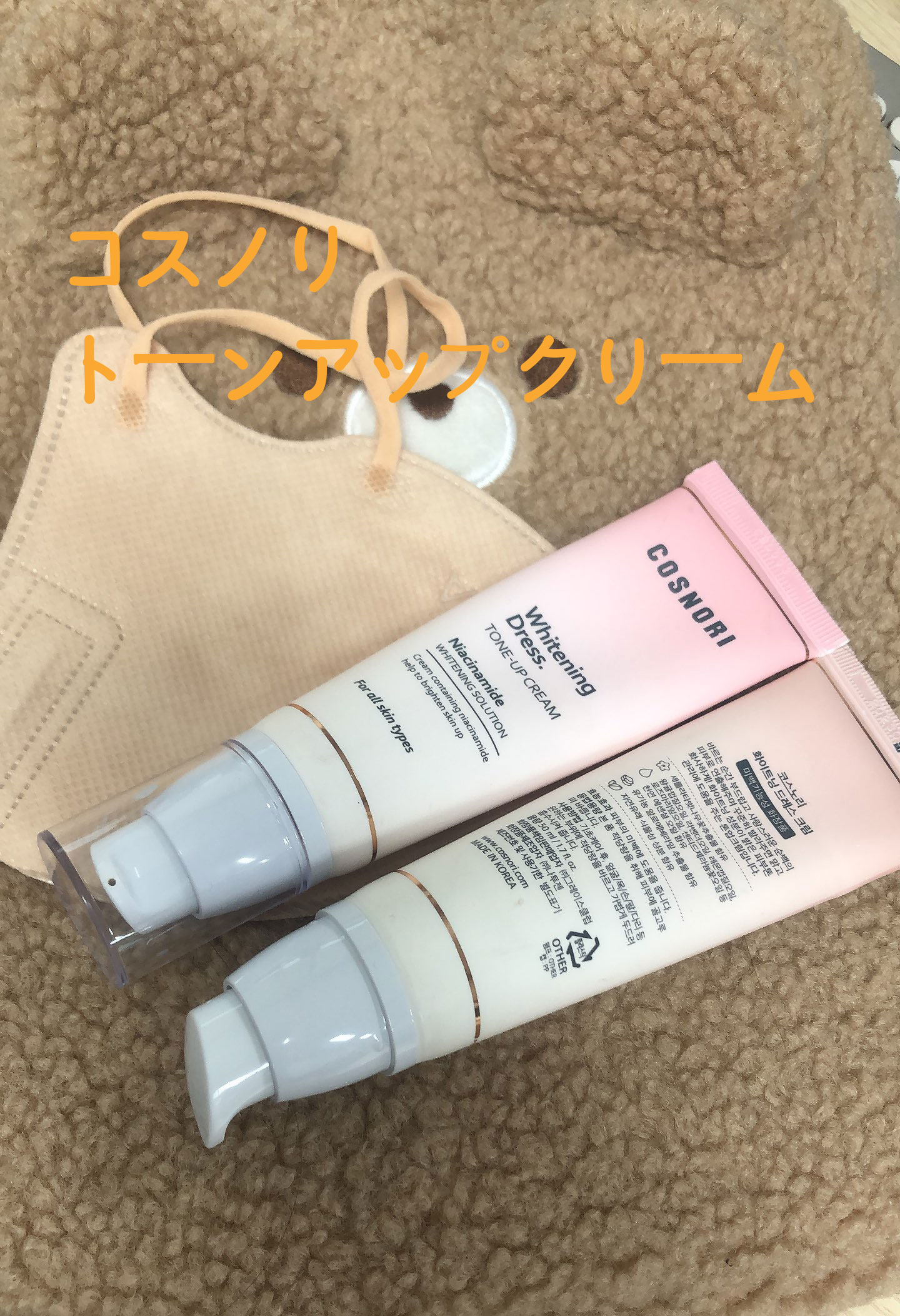【使った商品】【商品の特徴】肌が優雅で清純に見えます。#コスノリホワイトニングドレストーンアップクリームクリームは白い柔らかく軽いミルククリーム状です。マスクを着用している時でもメイクが落ちないんです。アレルギーがひどく、いつもマスクを着用し...