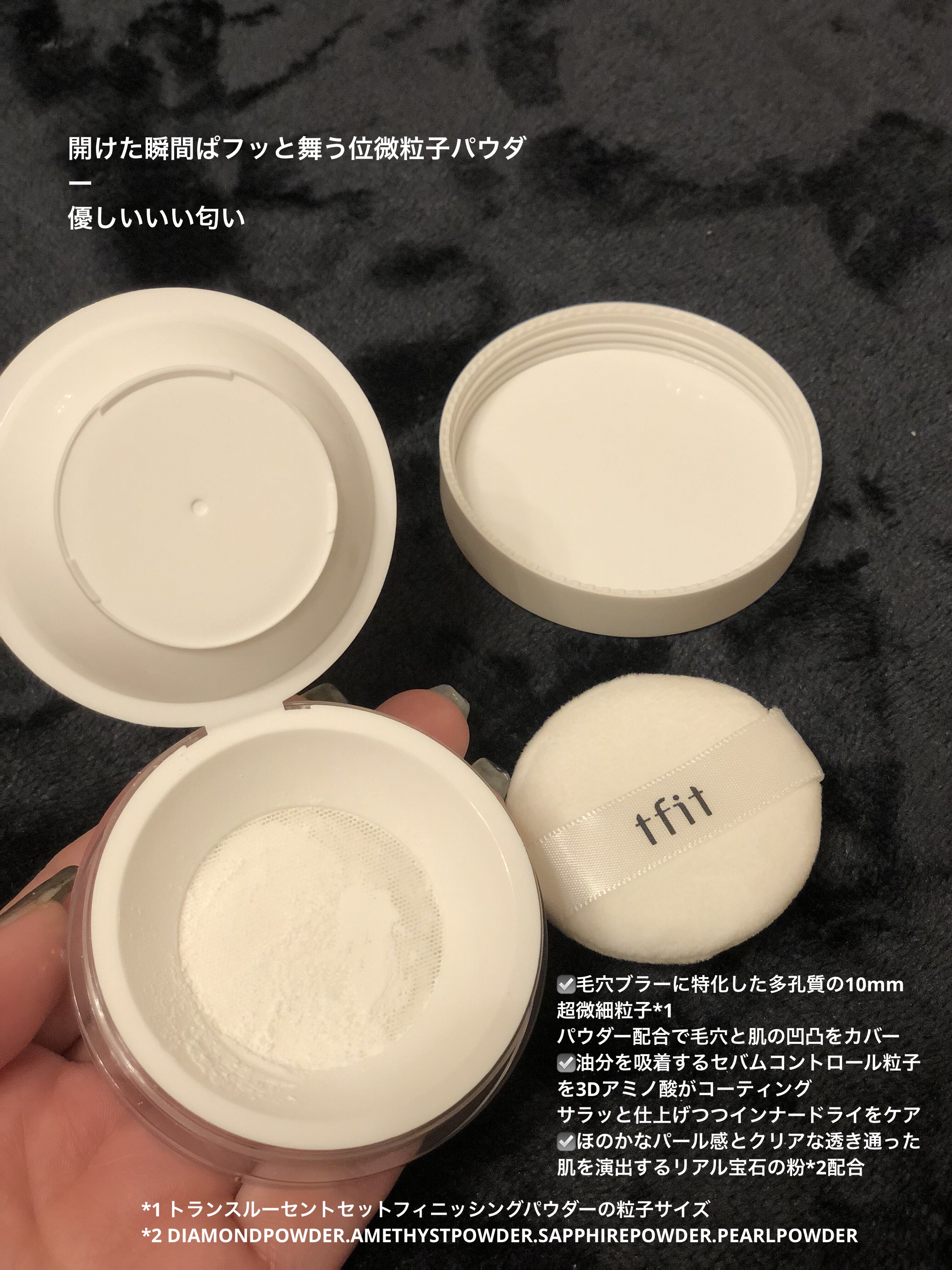 超微粒子パウダーのフィニッシングパウダーを使用しました🎵 コンシーラーやパウダーが有名なTFITのトランスルーセントセットフィニッシングパウダーです✨ 微粒子パウダーが皮脂を吸着し油分を抑えてくれるので、メイク崩れ防止にぴったり。更に、毛穴をぼかして陶器肌*を演出してくれるそうです。 内蓋が付いてるパウダー珍しい気がします。フィルムだと無くしてしまうことがあるので、一体型は嬉しい😆