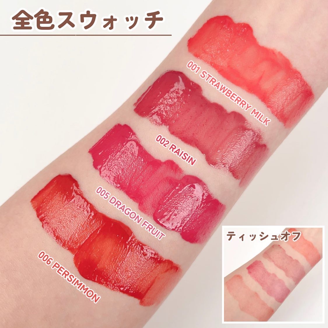 - <002 レーズン> 水、ダイマージリノール酸ダイマージリノレイルビス(ベヘニル/イソステアリル/フィトステリル)、グリセリン、BG、リンゴ酸ジイソステアリル、水添ポリシクロペンタジエン、トリ(カプリル酸/カプリン酸)グリセリル、水添ポリイソブテン、トリイソステアリン酸ポリグリセリル-2、イソドデカン、ジグリセリン、(アクリル酸ヒドロキシエチル/アクリロイルジメチルタウリンNa)コポリマー、ステアレス-21、1,2-ヘキサンジオール、イソステアリン酸ソルビタン、ヒドロキシアセトフェノン、トリ脂肪酸(C10-18)グリセリル、スクワラン、(アジピン酸/カプリン酸/カプリル酸/ヘプタン酸)ペンタエリスリチル、メントキシプロパンジオール、クエン酸、酢酸トコフェロール、ポリソルベート60、テトラ(ジ-t-ブチルヒドロキシヒドロケイヒ酸)ペンタエリスリチル、水酸化Al、トリエトキシカプリリルシラン [+/-] 酸化チタン、酸化鉄、赤202、赤227、黄4、黄5、青2 <005 ドラゴン フルーツ> 水、ダイマージリノール酸ダイマージリノレイルビス(ベヘニル/イソステアリル/フィトステリル)、グリセリン、BG、リンゴ酸ジイソステアリル、水添ポリシクロペンタジエン、トリ(カプリル酸/カプリン酸)グリセリル、水添ポリイソブテン、トリイソステアリン酸ポリグリセリル-2、イソドデカン、ジグリセリン、(アクリル酸ヒドロキシエチル/アクリロイルジメチルタウリンNa)コポリマー、ステアレス-21、1,2-ヘキサンジオール、イソステアリン酸ソルビタン、ヒドロキシアセトフェノン、トリ脂肪酸(C10-18)グリセリル、スクワラン、(アジピン酸/カプリン酸/カプリル酸/ヘプタン酸)ペンタエリスリチル、メントキシプロパンジオール、クエン酸、酢酸トコフェロール、ポリソルベート60、テトラ(ジ-t-ブチルヒドロキシヒドロケイヒ酸)ペンタエリスリチル、水酸化Al、トリエトキシカプリリルシラン [+/-] 酸化チタン、酸化鉄、赤202、赤227、黄4、黄5、青3 <007 ウォルナット> 水、ダイマージリノール酸ダイマージリノレイルビス(ベヘニル/イソステアリル/フィトステリル)、グリセリン、BG、リンゴ酸ジイソステアリル、水添ポリシクロペンタジエン、トリ(カプリル酸/カプリン酸)グリセリル、水添ポリイソブテン、トリイソステアリン酸ポリグリセリル-2、イソドデカン、ジグリセリン、(アクリル酸ヒドロキシエチル/アクリロイルジメチルタウリンNa)コポリマー、ステアレス-21、1,2-ヘキサンジオール、イソステアリン酸ソルビタン、ヒドロキシアセトフェノン、トリ脂肪酸(C10-18)グリセリル、スクワラン、(アジピン酸/カプリン酸/カプリル酸/ヘプタン酸)ペンタエリスリチル、メントキシプロパンジオール、クエン酸、酢酸トコフェロール、ポリソルベート60、テトラ(ジ-t-ブチルヒドロキシヒドロケイヒ酸)ペンタエリスリチル、水酸化Al、トリエトキシカプリリルシラン [+/-] 酸化チタン、酸化鉄、赤202、赤227、黄4、黄5、青1 <009 ルバーブ> 水、ダイマージリノール酸ダイマージリノレイルビス(ベヘニル/イソステアリル/フィトステリル)、グリセリン、BG、リンゴ酸ジイソステアリル、水添ポリシクロペンタジエン、トリ(カプリル酸/カプリン酸)グリセリル、水添ポリイソブテン、トリイソステアリン酸ポリグリセリル-2、イソドデカン、ジグリセリン、(アクリル酸ヒドロキシエチル/アクリロイルジメチルタウリンNa)コポリマー、ステアレス-21、1,2-ヘキサンジオール、イソステアリン酸ソルビタン、ヒドロキシアセトフェノン、トリ脂肪酸(C10-18)グリセリル、スクワラン、メントキシプロパンジオール、クエン酸、(アジピン酸/カプリン酸/カプリル酸/ヘプタン酸)ペンタエリスリチル、酢酸トコフェロール、ポリソルベート60、テトラ(ジ-t-ブチルヒドロキシヒドロケイヒ酸)ペンタエリスリチル、トリエトキシカプリリルシラン [+/-] 酸化チタン、酸化鉄、赤202、赤227、黄4、黄5、青1 <001 ストロベリーミルク> 水、ダイマージリノール酸ダイマージリノレイルビス(ベヘニル/イソステアリル/フィトステリル)、グリセリン、BG、リンゴ酸ジイソステアリル、水添ポリシクロペンタジエン、トリ(カプリル酸/カプリン酸)グリセリル、水添ポリイソブテン、トリイソステアリン酸ポリグリセリル-2、イソドデカン、ジグリセリン、(アクリル酸ヒドロキシエチル/アクリロイルジメチルタウリンNa)コポリマー、ステアレス-21、1,2-ヘキサンジオール、イソステアリン酸ソルビタン、ヒドロキシアセトフェノン、トリ脂肪酸(C10-18)グリセリル、スクワラン、(アジピン酸/カプリン酸/カプリル酸/ヘプタン酸)ペンタエリスリチル、メントキシプロパンジオール、クエン酸、酢酸トコフェロール、ポリソルベート60、テトラ(ジ-t-ブチルヒドロキシヒドロケイヒ酸)ペンタエリスリチル、水酸化Al、トリエトキシカプリリルシラン [+/-] 酸化チタン、酸化鉄、赤202、赤227、黄4、黄5、青1 <004 ダーク チェリー> 水、ダイマージリノール酸ダイマージリノレイルビス(ベヘニル/イソステアリル/フィ