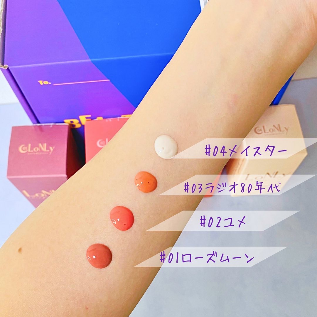 - <01 Rose Moon> 水、メチルトリメチコン、ジメチコン、エチルヘキサン酸セチル、イソノナン酸イソノニル、エタノール、ポリブテン、グリセリン、PEG-10ジメチコン、ペンチレングリコール、(ビニルジメチコン/メチコンシルセスキオキサン)クロスポリマー、1,2-ヘキサンジオール、加水分解フィブロイン、グリセリルグルコシド、ビスジグリセリルポリアシルアジペート-2、ジステアルジモニウムヘクトライト、硫酸Mg、マイカ(CI77019)、酸化チタン(CI77891)、酸化鉄(CI77491)、グンジョウ(CI77007)、赤226(CI73360)、酸化鉄(CI77492)、酸化鉄(CI77499)、BG、トリエトキシカプリリルシラン、オキシ水酸化Al、セチルPEG/PPG-10/1ジメチコン、クワ葉エキス、エチルヘキシルグリセリン、エチレンジアミンジコハク酸3Na <02 YU-ME> 水、メチルトリメチコン、ジメチコン、エチルヘキサン酸セチル、イソノナン酸イソノニル、エタノール、ポリブテン、グリセリン、PEG-10ジメチコン、ペンチレングリコール、(ビニルジメチコン/メチコンシルセスキオキサン)クロスポリマー、1,2-ヘキサンジオール、加水分解フィブロイン、グリセリルグルコシド、ビスジグリセリルポリアシルアジペート-2、ジステアルジモニウムヘクトライト、硫酸Mg、マイカ(CI77019)、赤226(CI73360)、酸化チタン(CI77891)、酸化鉄(CI77492)、酸化鉄(CI77491)、グンジョウ(CI77007)、酸化鉄(CI77499)、BG、トリエトキシカプリリルシラン、オキシ水酸化Al、セチルPEG/PPG-10/1ジメチコン、マグワ葉エキス、エチルヘキシルグリセリン、エチレンジアミンジコハク酸3Na <03 Radio 80’s > 水、メチルトリメチコン、ジメチコン、エチルヘキサン酸セチル、イソノナン酸イソノニル、エタノール、ポリブテン、グリセリルグルコシド、PEG-10ジメチコン、1,2-ヘキサンジオール、グリセリン、(ビニルジメチコン/メチコンシルセスキオキサン)クロスポリマー、ペンチレングリコール、BG、加水分解フィブロイン、ジステアルジモニウムヘクトライト、ビスジグリセリルポリアシルアジペート-2、硫酸Mg、酸化チタン(CI77891)、酸化鉄(CI77491)、酸化鉄(CI77499)、セチルPEG/PPG-10/1ジメチコン、クワ葉エキス、エチルヘキシルグリセリン、エチレンジアミンジコハク酸3Na <04 May Star> 水、メチルトリメチコン、ジメチコン、エチルヘキサン酸セチル、イソノナン酸イソノニル、エタノール、ポリブテン、グリセリルグルコシド、PEG-10ジメチコン、1,2-ヘキサンジオール、グリセリン、(ビニルジメチコン/メチコンシルセスキオキサン)クロスポリマー、ペンチレングリコール、BG、加水分解フィブロイン、ジステアルジモニウムヘクトライト、ビスジグリセリルポリアシルアジペート-2、硫酸Mg、酸化チタン(CI77891)、酸化鉄(CI77492)、酸化鉄(CI77491)、酸化鉄(CI77499)、セチルPEG/PPG-10/1ジメチコン、クワ葉エキス、エチルヘキシルグリセリン、エチレンジアミンジコハク酸3Na