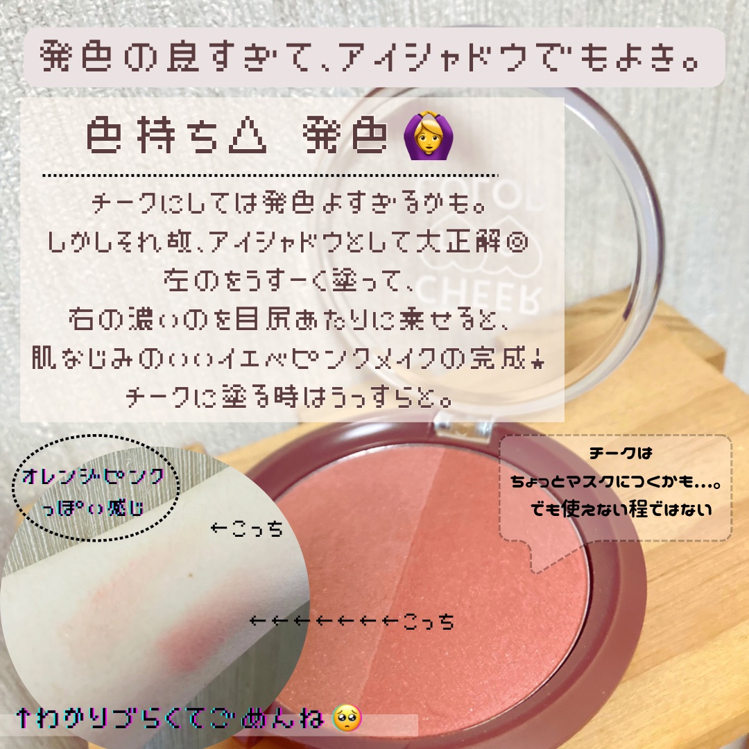 ほんとに色味が絶妙で、 モチもそこそこいいのでおすすめです! この抜け感グレージュ試してみたくて!!! 黒や茶のアイラインだと、 結構キツくなっちゃうので、 この程よい存在感を求めてた!!! 最近は目尻にちょろっと引く程度だから、 1日経ってもよれなかったし、 これはリピ確定! 他の色も試してみたい🙆♀️ ちょっとラメな、 イエベなピンクチーク欲しいなーと思ってて。 あーかわいいピンク🫶 気持ちオレンジピンクっぽい感じと言ったらいいのかな? 思いのほか発色がよいので、 アイシャドウにも使える! ほんとにグレージュアイライナー×ピンクチークの相性がよすぎたので、 ぜひ試して見てねー!