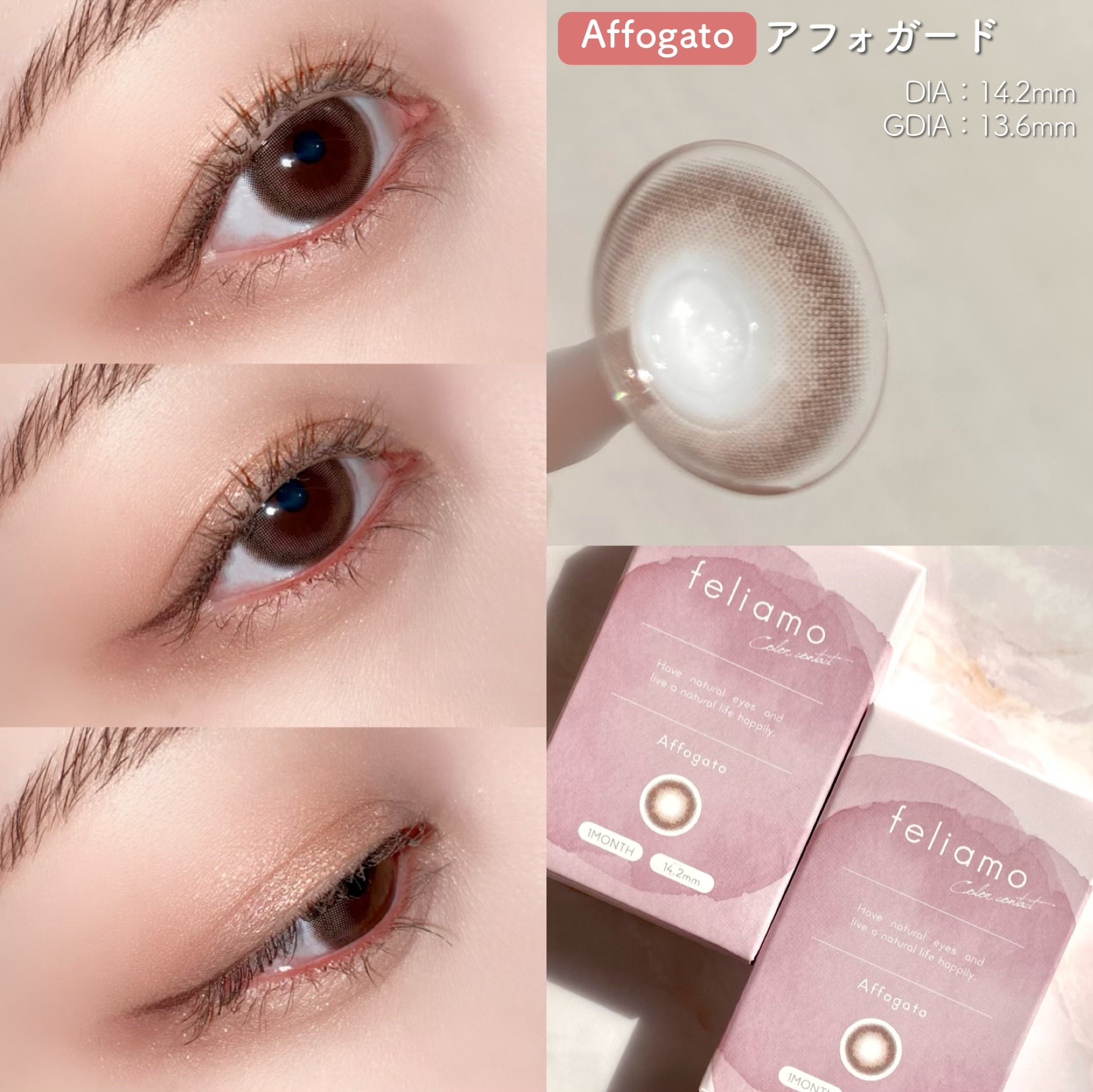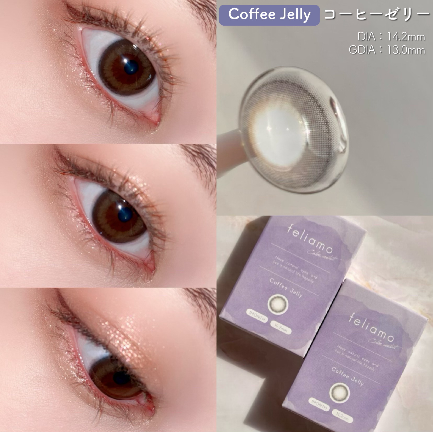 - ※2025年6月以降、商品パッケージ裏面・側面の一部表記を順次変更いたします。尚、これにかかる商品の交換・返品は承っておりません。 どんな瞬間にも溶け込む誰からも愛される瞳へ feliamoの由来は felice amore~幸せな愛~ 瞳から愛されオーラを放つ好印象レンズで女性らしさと品を演出。 オンも、オフも、特別な日も。 どんな場面にも溶け込むレンズラインナップで誰からも愛される瞳に。 ■うるつや透明感 × こっそり盛れ ナチュラルレンズ Coffee Jelly(コーヒーゼリー) ■じゅわっと透明感 × ふんわり盛れ すこし大きめレンズ Affogato(アフォガード) ■ナチュラル細フチ×裸眼盛れ トキメキうるみレンズ Oolong Tea(ウーロンティー) ■トレンド太フチ×くりっと盛れ 無敵ブラウンレンズ Tarte Tatin(タルトタタン) ■じゅわっとフチ×甘かわ盛れ あざとブラウンレンズ Tiramisu Ring(ティラミスリング) ■シュガーパール 大人気カラーBrulee Pearl(ブリュレパール)の色違いグレーレンズ! 細フチの使いやすいグレーで、どんな瞳の色(黒目・茶目)でもナチュラルに光をとりこみ、うるっと奥行きのあるこなれ可愛い印象に。 おでかけにぴったりなレンズです! 清楚な瞳になれるヒ・ミ・ツは・・・? ちゅるん細フチ×うるキラグレーカラー! ■メルティバター 盛れるのにバレにくい、毎日使えるナチュラルブラウンレンズ! じゅわっととろけるようなブラウンで、ふんわりやさしげな瞳に! どんなメイクにも似合うから毎日使える!自然に盛れる大きめブラウンレンズはfeliamoにお任せ♡ 多幸感のある印象の瞳のヒ・ミ・ツは・・・? ぼかしナチュラルブラウン×じゅんわりとろけるブラウンカラー カラーコンタクトレンズの不適正使用による眼障害の危険性等などがあります。 ●コンタクトレンズは高度管理医療機器です。不十分な洗浄・消毒など不適切なケアや、長時間・交換期間を超えた装用により、アレルギー性結膜炎、角膜感染症、角膜潰瘍等の重篤な眼障害が発生する危険性があります ●ご使用前に取扱説明書を確認してください 使用上の留意事項 ●眼科医院等を受診してからお求めください ●眼に異常を感じたら直ちにレンズ使用を中止し、お近くの眼科等で診察を受けてください ●医師の指示にしたがってご使用ください ●コンタクトレンズを装用する場合、自覚症状がなくても、眼科医院等での定期検査を受けてください ●レンズに不具合がある場合は使用しないでください