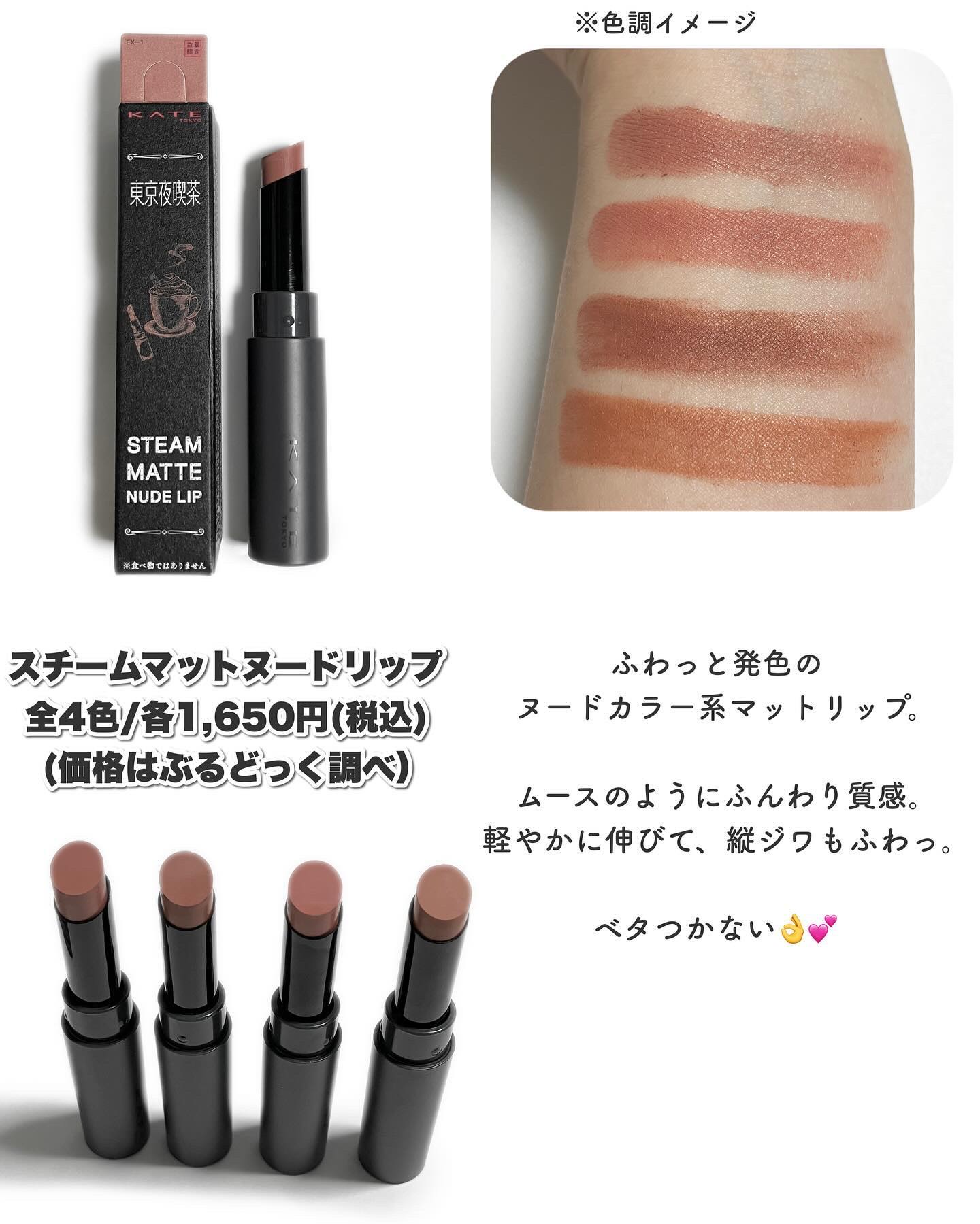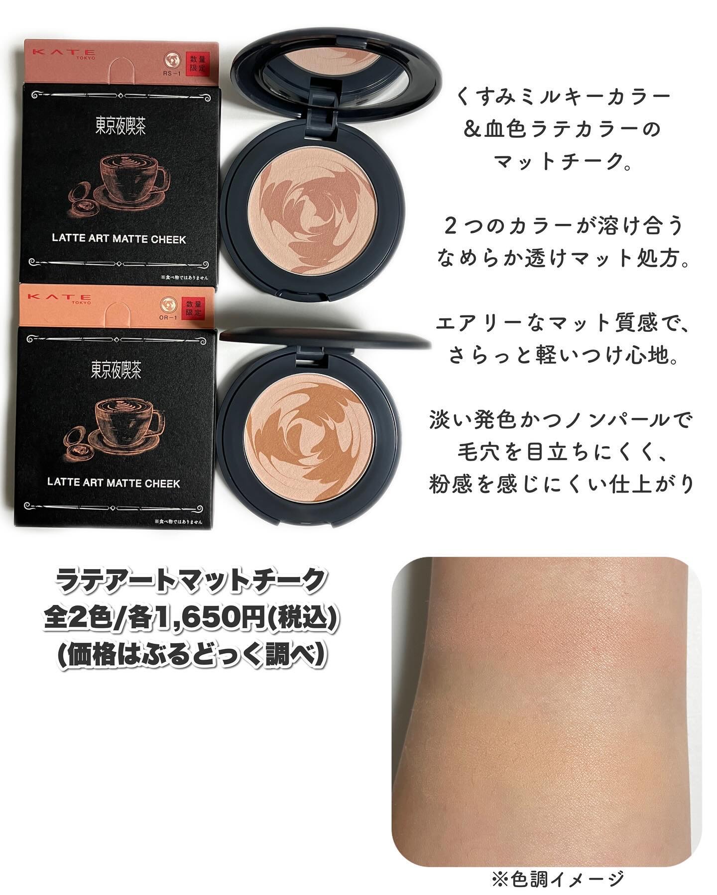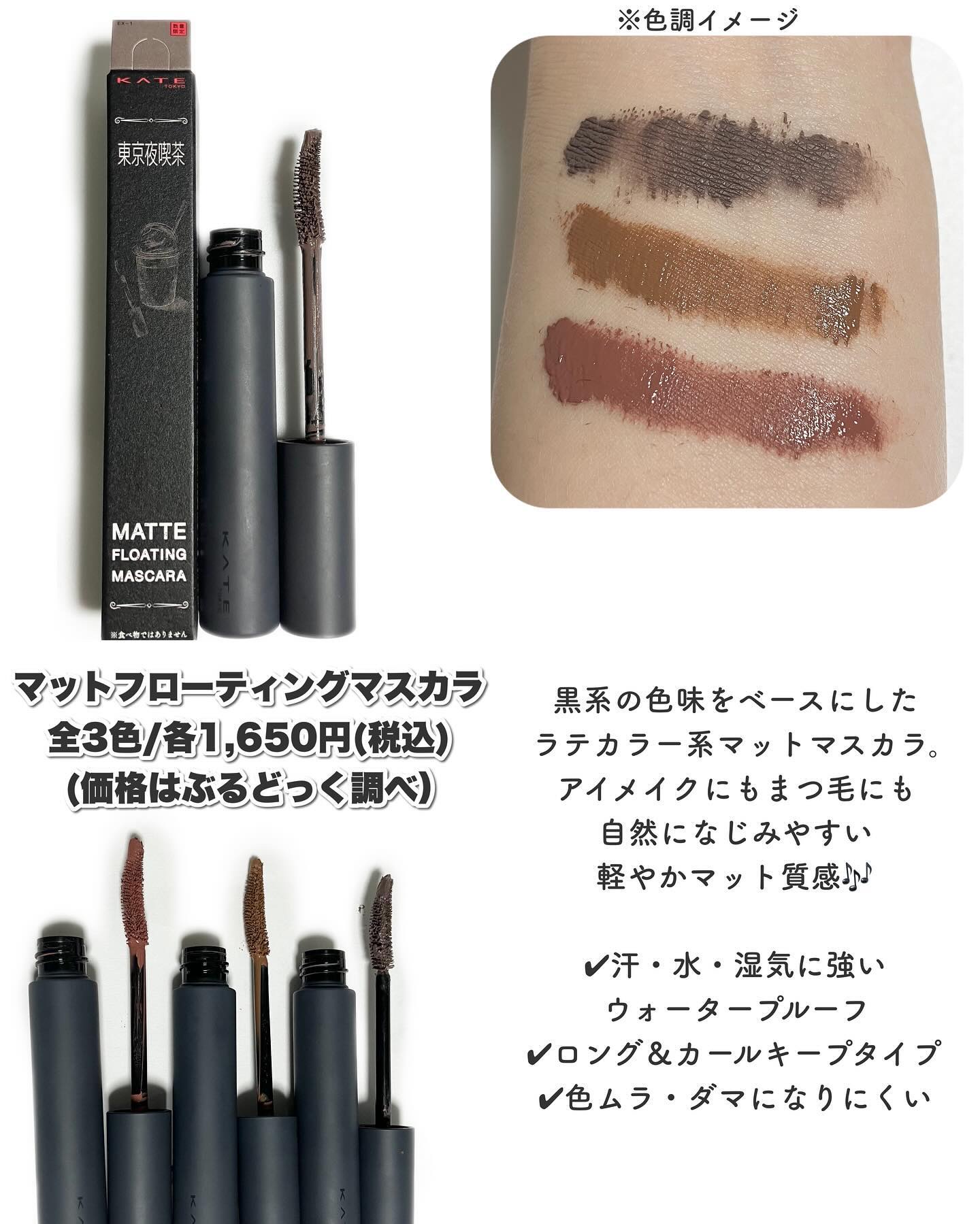 極マットコレクション "東京夜喫茶"が数量限定で発売されるそう🥰 ムースの様なふわっと軽い質感のリキッドで、ベタつかず、なめらかにスムースに塗り広げられるよ🎶 肌なじみの良いカラーで、ベースカラーとして使っても、単色でも可愛い🥰 発色は良いけど、浮すぎずオシャレな色味のカラーマスカラ🎶 マットラテリキッドシャドウとの相性もバッチリ👍 ヌード系カラーがまたオシャレ✨ ラテアートの様に2色が入った見た目も可愛いチーク💕 ふわっと軽やかでなめらかな質感😌 濃くつきすぎず、ふわっと色づいてくれるのも🫶