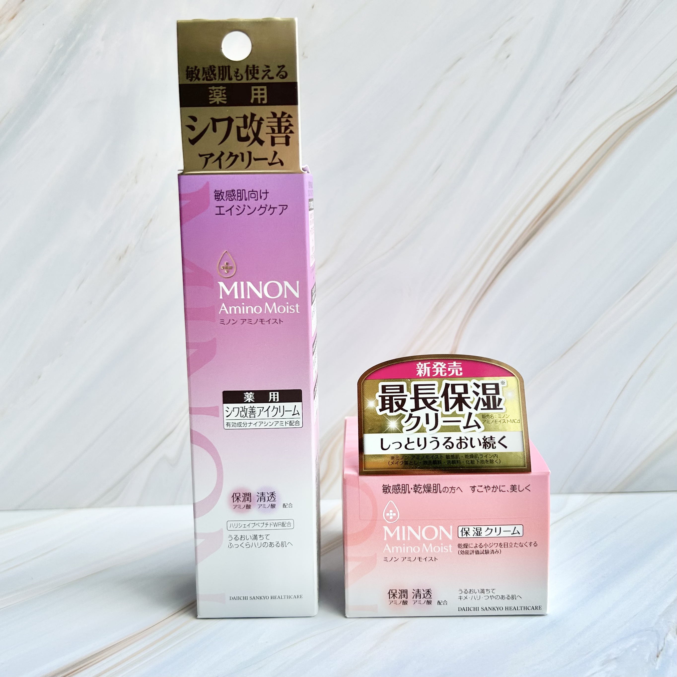 ミノン アミノモイストは敏感肌向けシリーズ。乾燥肌、混合肌、エイジングケアと3つのラインがあります。 全ライン共通で、9種の保潤アミノ酸配合・バリン・トレオニン・セリン・ロイシン・プロリン・ヒスチジン・グリシン・アラニン・アルギニン こっくりではなく軽めの質感のクリームで、馴染ませるとしっとり🫧