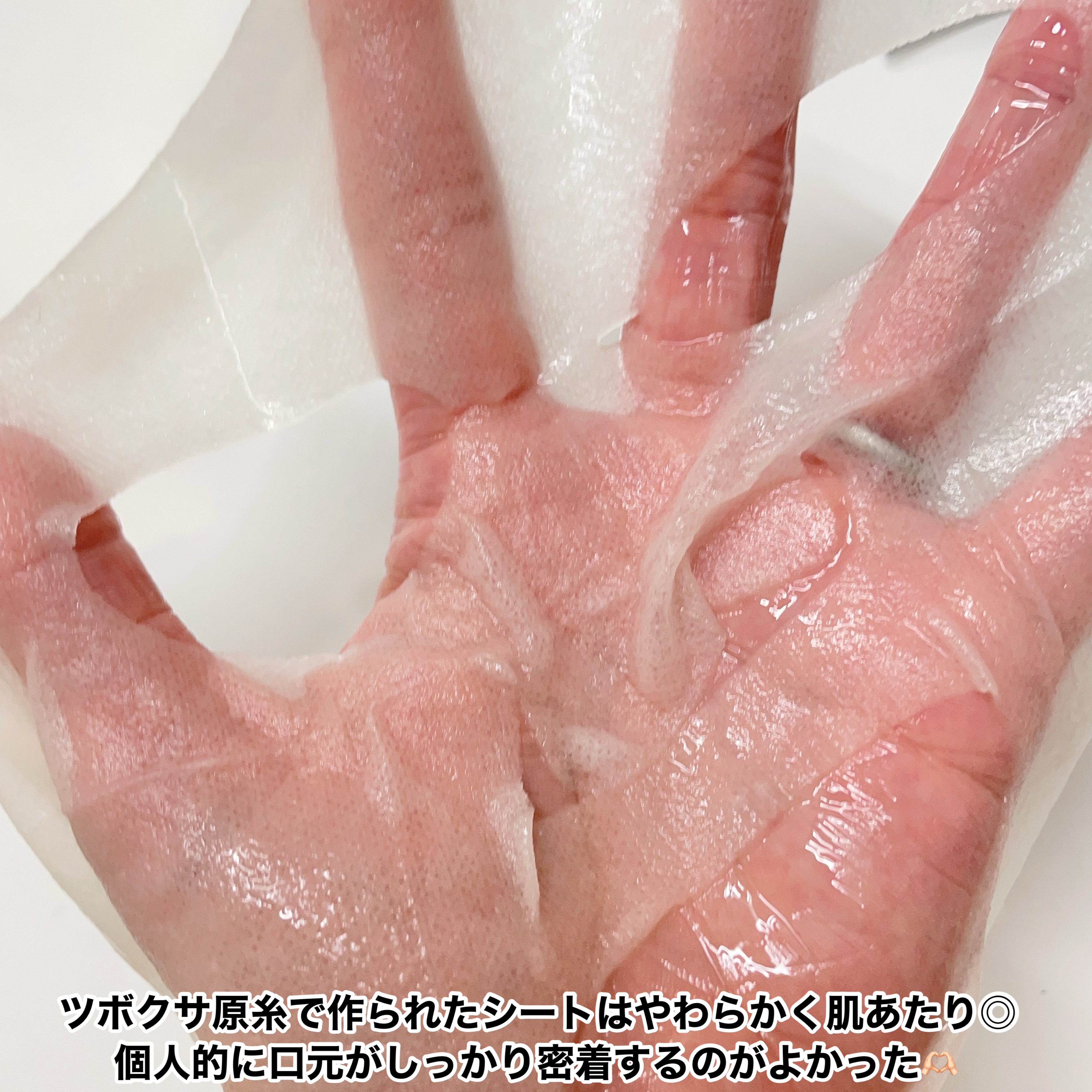 化粧水タイプのフェイスマスクでベタつきはなく、さっぱりめな感じなので朝のメイク前にも◎ 厚めのシートで肌あたりがよく、剥がれにくいのもよかった! 美容液もたっぷり入ってるので、パック後は全身の保湿ケアにも使ったよ🫶🏻 目の周りが小さめに作られてるんだけど、目頭を押さえて引っ張ると目元にピタッと密着するのでおすすめ♡ 7枚入りは440円というプチプラなので気になる方はぜひチェックしてみてね🥳💕