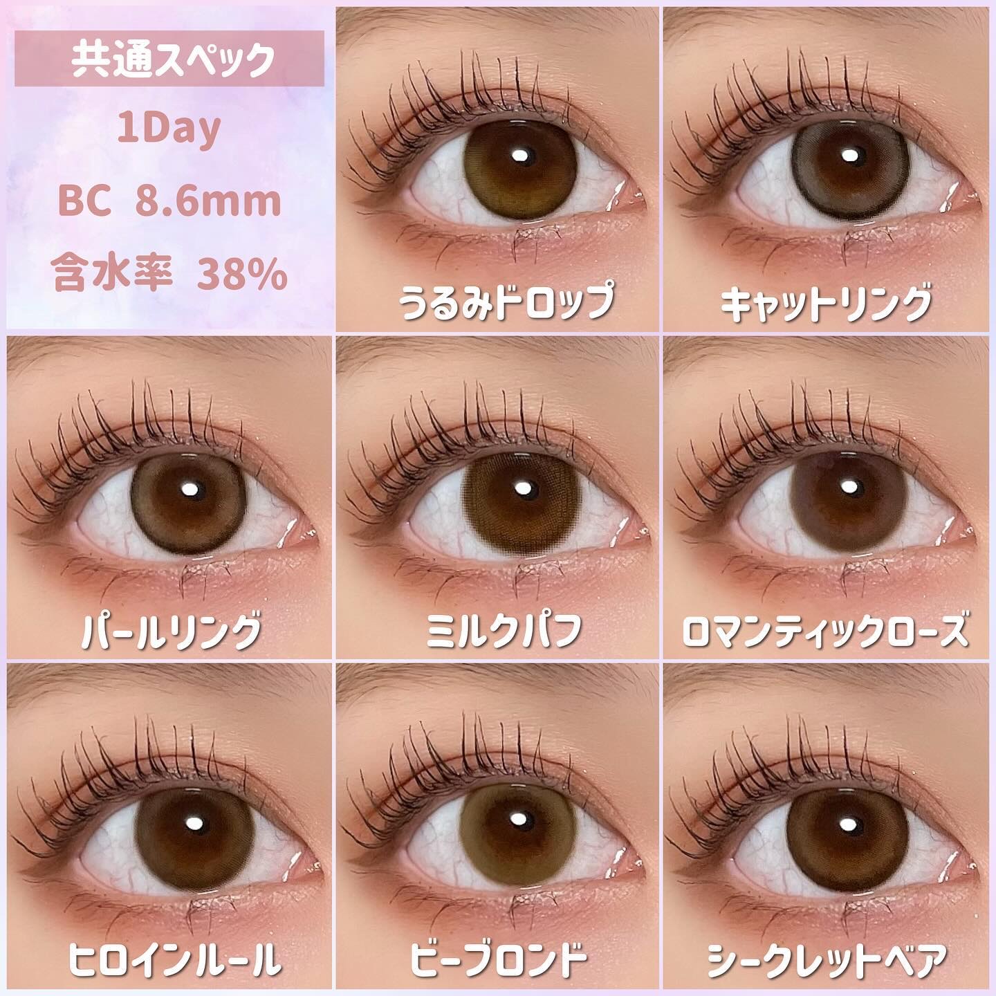 - 時には甘く、時にはオトナに。デザインだけでなく使いやすさにもこだわった、ナチュラルだけどしっかり可愛くなれるラインナップ。 一からこだわってつくった、いろんなメイクやファッションに合わせて楽しめるオトナ女子もつかいやすいナチュラルカラーのレンズデザインです。 毎日使うものだからこそ、レンズスペックまでこだわりました。 〇超薄型レンズ採用 0.06mmの超薄型レンズを採用。負担の少ない使い心地で、快適にお使いいただけます。 ※装用感には個人差があります。 〇日差しもケア UVカット機能 紫外線UV-Aを約50%、UV-Bを約95%、レンズに配合されたUV吸収材でカット。 ※目全体及び目の周辺を完全に覆っているわけではないのでUV防止用眼鏡・サングラスの代用にはなりません。 〇うるおい成分配合 うるおい成分、"MPCポリマー"がレンズをやさしく包み込むので、うるおい長持ち。 〇乾きにくい低含水レンズ 低含水レンズ素材は、水分蒸発量が少ないため、乾きにくいのが特徴。 カラーコンタクトレンズの不適正使用による眼障害の危険性等などがあります。 ●コンタクトレンズは高度管理医療機器です。不十分な洗浄・消毒など不適切なケアや、長時間・交換期間を超えた装用により、アレルギー性結膜炎、角膜感染症、角膜潰瘍等の重篤な眼障害が発生する危険性があります ●ご使用前に取扱説明書を確認してください 使用上の留意事項 ●眼科医院等を受診してからお求めください ●眼に異常を感じたら直ちにレンズ使用を中止し、お近くの眼科等で診察を受けてください ●医師の指示にしたがってご使用ください ●コンタクトレンズを装用する場合、自覚症状がなくても、眼科医院等での定期検査を受けてください ●レンズに不具合がある場合は使用しないでください