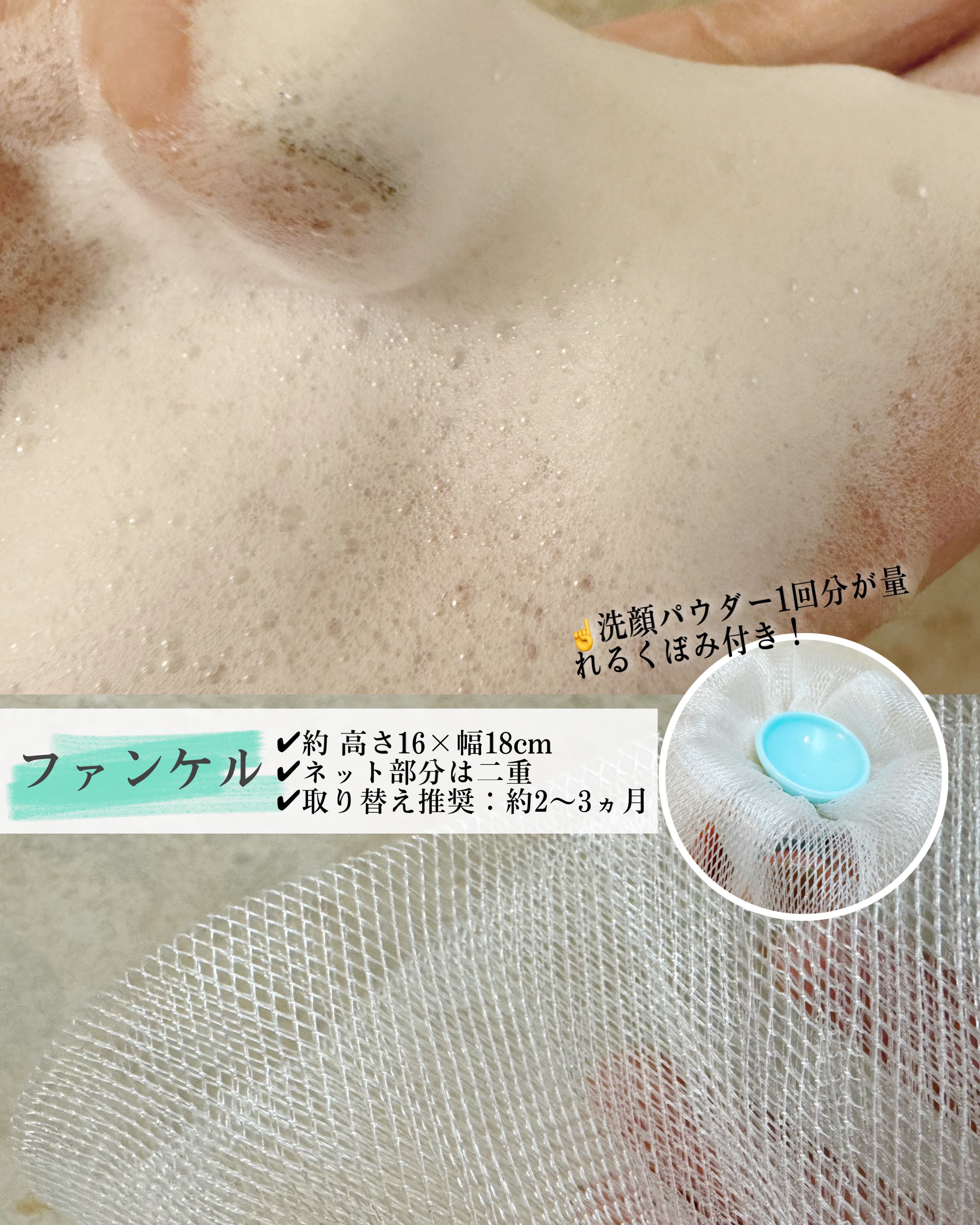 泡立てネット誰でも簡単に素早くキメ細かい濃密もっちり泡がつくれるネット。二重のネットが空気と水を効率的に含むので、どんなタイプの洗顔料もたっぷり泡立ちます。清潔に保管するための吊り下げひもと、洗顔パウダーの使用1回分の目安が量れるくぼみ付き。...