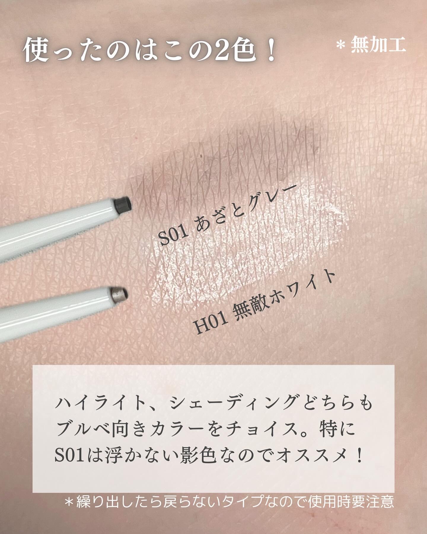 発色は淡くてあんまり使った前後で違いがわかりにくいので調整しやすいです! パウダーをブラシでつけると広く着けすぎたりしちゃいますがこれはピンポイントで塗れます! S02は馴染みのいいブラウンカラーで唇の影とか人中短縮に使いやすいと思いました! キャンメイクのアイライナーより硬めに作られてる印象があるのでそこだけ気をつけて使ってます!