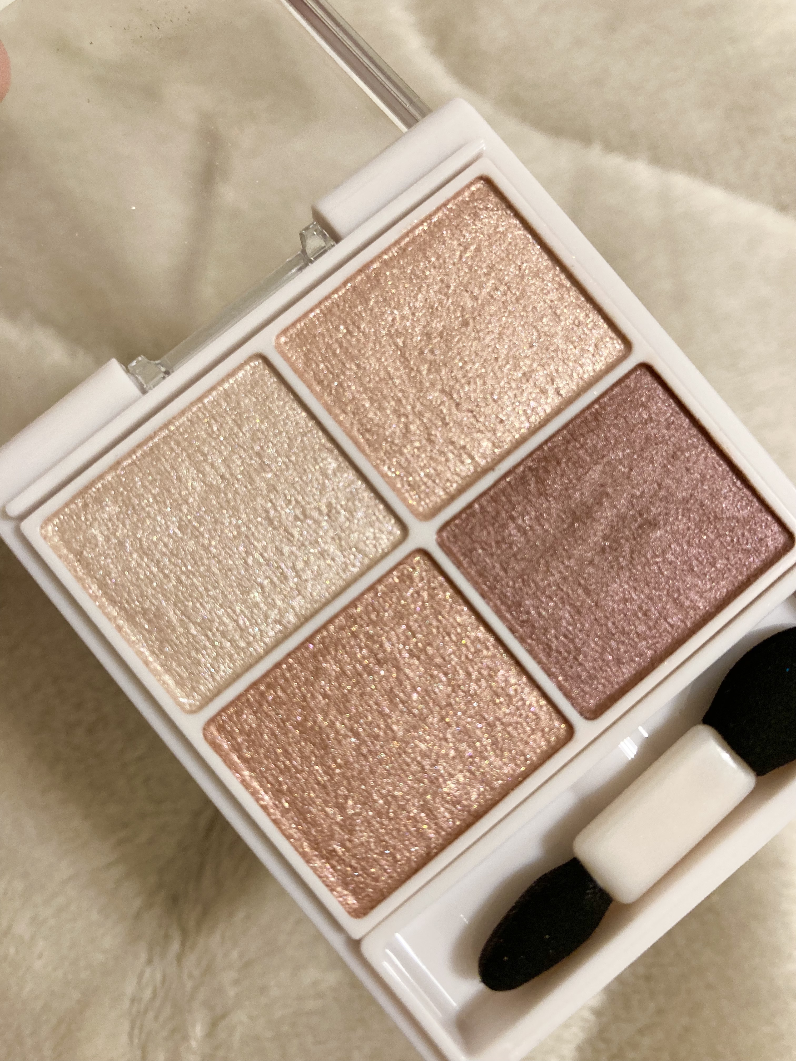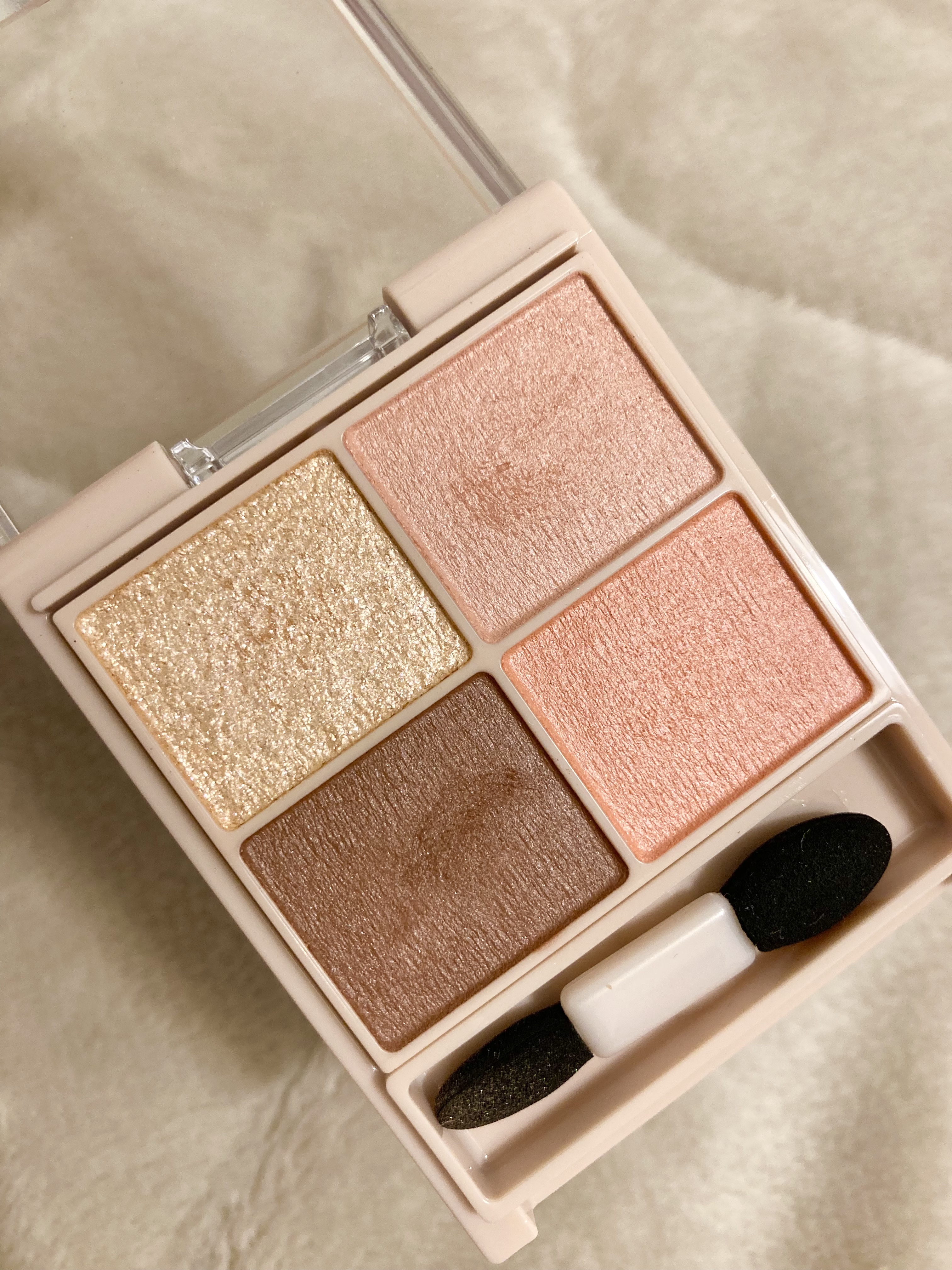 このアイシャドウは繊細なラメが入っていてまぶたに塗ると綺麗な光沢感が出ます✨ 真ん中のラメだけ少しギラっとしたラメ感になっています。 左下のオレンジはブラウンが混じったようなオレンジなのでとても使いやすくて深みも出せるので気に入っています🧡 右上のイエローはイチョウの葉のような色をしていてアイホール全体に塗ってもとっても可愛いカラーになっています😊 そして、真ん中の色はシルバーラメとピンクラメがたっぷり入っていて私は涙袋によく使っています☺️ 粉質はあまりしっとりはしていないので、私はアイシャドウベースを併用しています。 落ち着いた配色なのでこなれ感もあり、これ1つでオレンジメイクもイエローメイクもできてしまうので良いなと思いました🥰