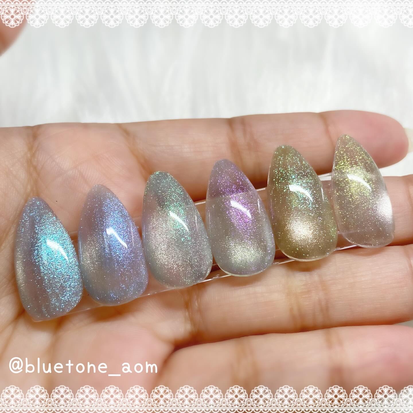 ラメがしっかりしてるし クリアカラーが入ってるから オーロラパウダー無しでも 充分キラキラしました! 反射強めのフィルムなので 実物はもっと うるうるとキラキラが強いです! ビー玉みたい🥺 ネイルシール長持ちさせたいけど ちょっと飽きてきたな〜って時とかに 全然違った印象になるのでオススメです! Seriaのベースジェル 本当にうるうるネイルしやすいので オススメしたい🙆♀️