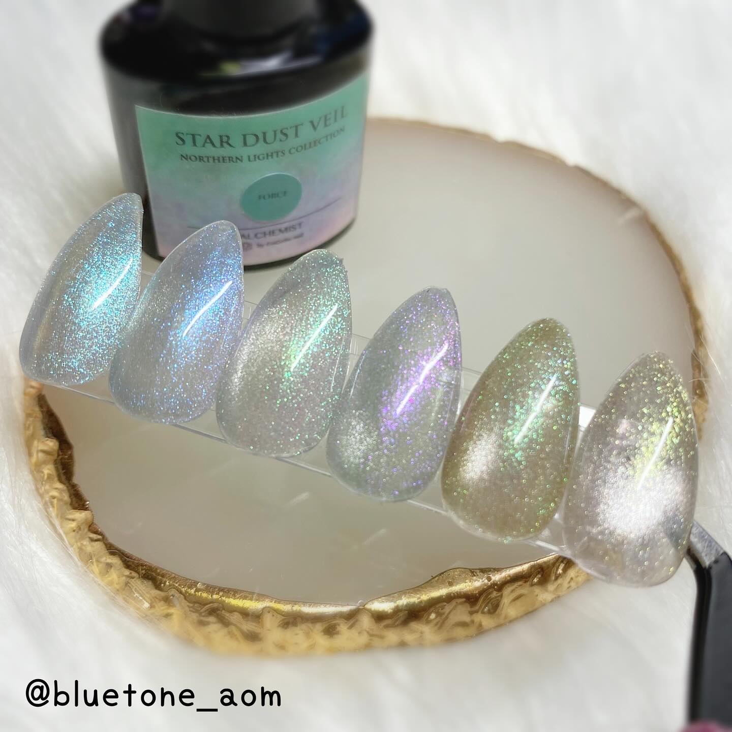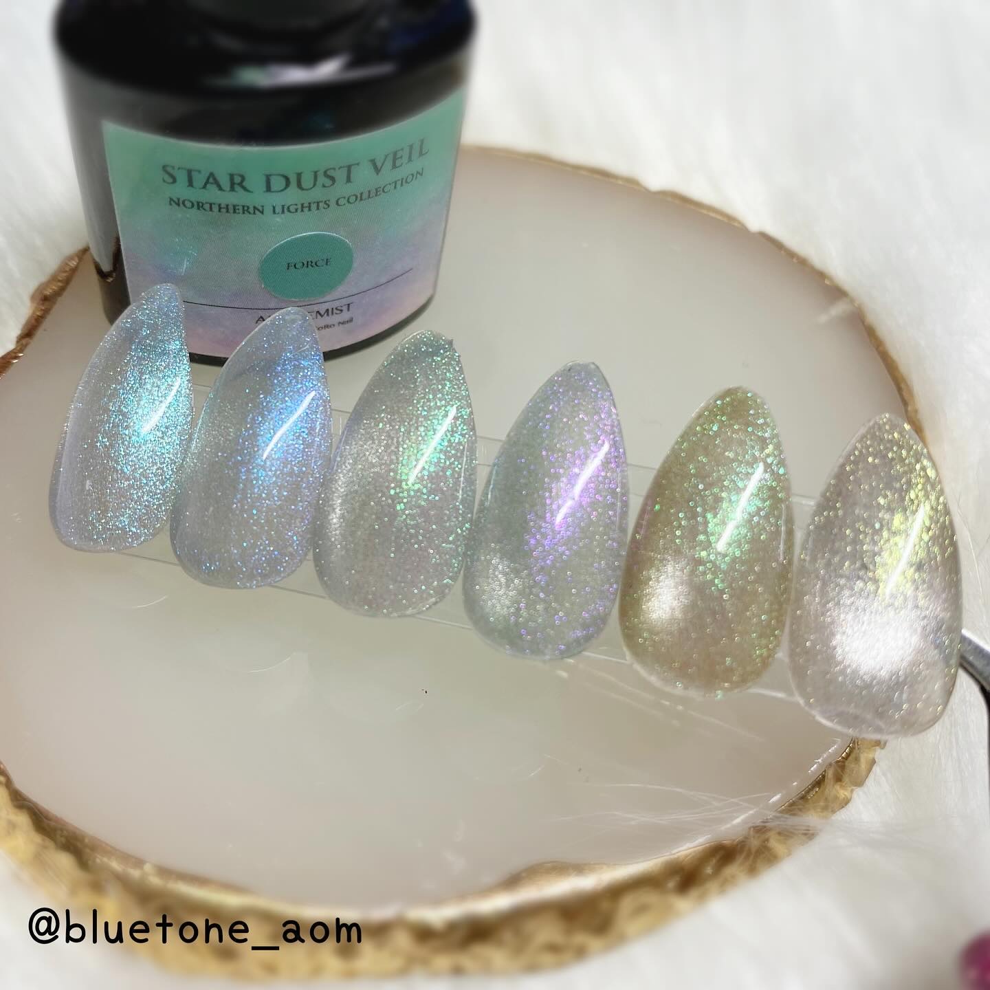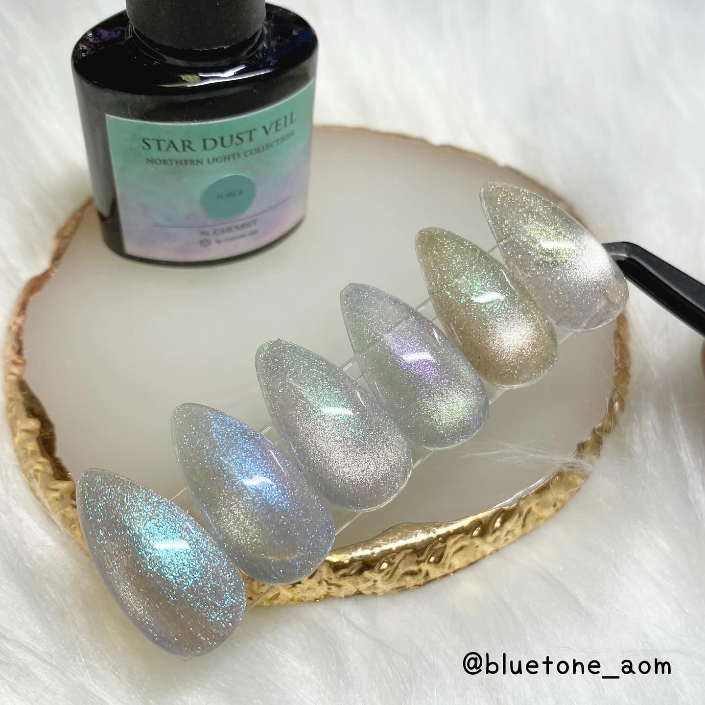 ベースカラーを塗ったらノンワイプトップを塗って硬化します。 クリア→ミラー感はあるけど、発色はそこまで濃くないのでガッツリシルバーを求めてる人は物足りないかも🤔 ホワイト→キレイにシルバーになりました! ミルキーホワイト→シャンパンゴールドみたいな落ち着いたゴールドっぽくなりました😳 ブラック→キレイにシルバーに!やっぱりブラックとシルバーは映えますね🤝ギラギラです! パウダーの粒子はちょっと大きめなのでちょっと不安でしたが擦ってみるとキレイにミラーになりました! ベースカラーで見え方も変わるので色々試しても面白いかもです🥰