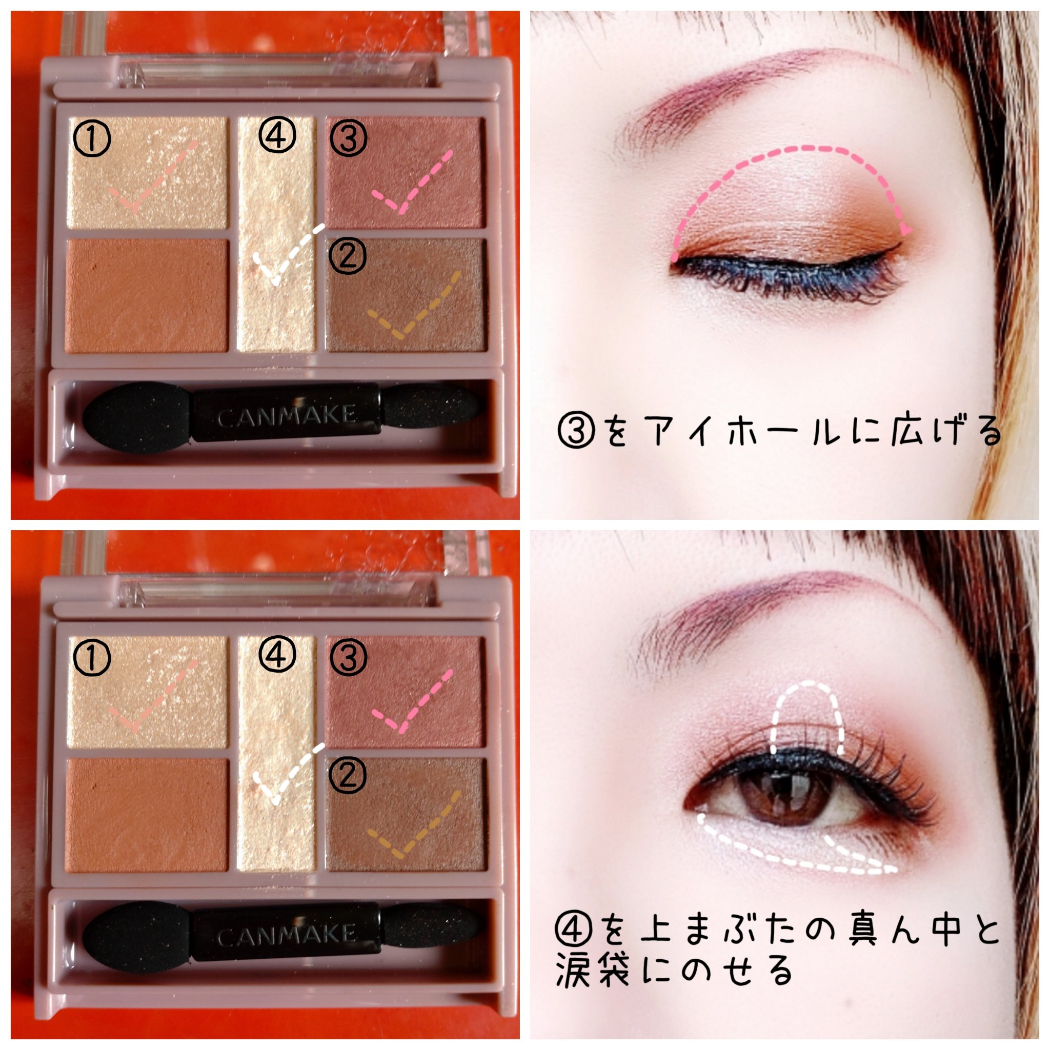 - 1枚のパレットで2つのスタイルが完成! 5色の欲ばりアイシャドウ♥ メインカラーを選んで2つのスタイルが楽しめる! A→B→D でスタイル1 A→C→D でスタイル2 繊細な粉質が、しっとりとまぶたに密着して色落ちを防ぎます。 透明感のあるキラうるトッピングジュエル(繊細ラメ)は、気分によってトッピング!
