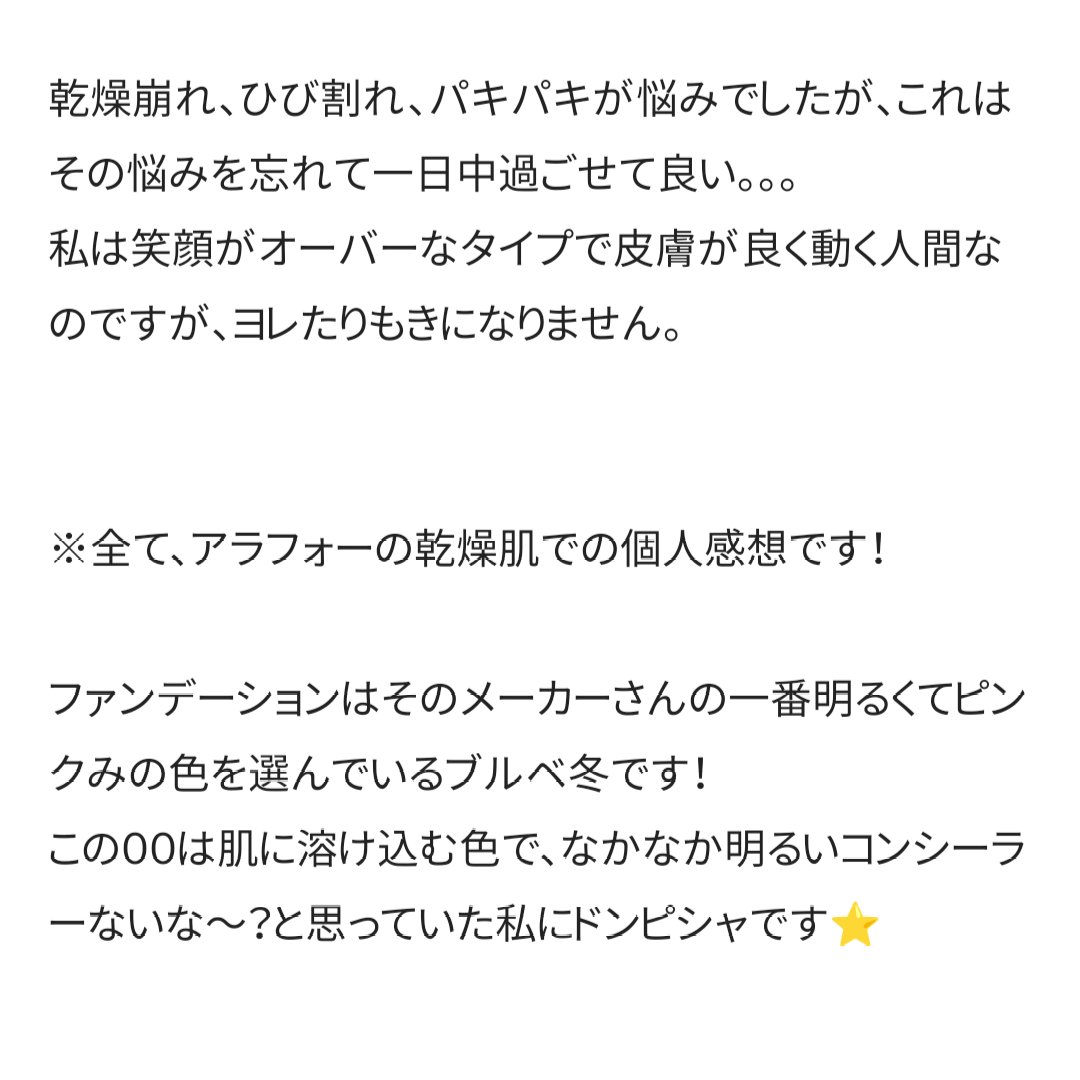 キメが綺麗に見える(写真で伝えきれなくてすみません) 瑞々しい艶もカバー力も両立! 色ムラ赤み充分カバー!ホクロもけっこう目立たなくなる マスクこすれにも耐性強め。付きづらい。 乾燥肌がいつもの悩みですが乾燥崩れしなかった テカリについては、私が元々テカらないので わかりませんでした。鬼乾燥肌です! めちゃトーンアップする 透明感出るというか潤いで満たされた質感 艶けっこうある、潤い膜を形成する処方みたい。 これ一本でも充分な美肌補正 保湿感高い。なめらか肌になる これとお粉だけでメイクしたら乾燥崩れしなかった。いつも驚くほど乾燥崩れするから嬉しいね!