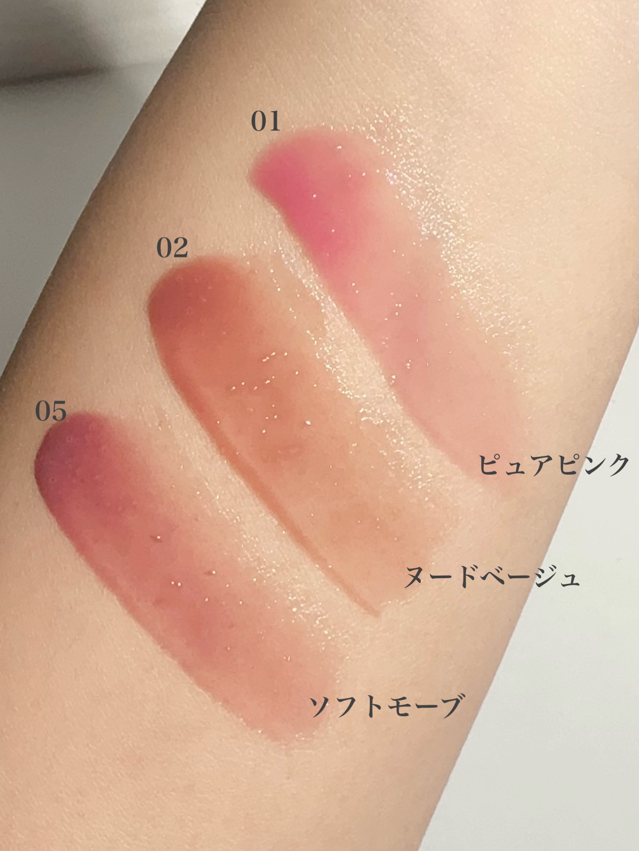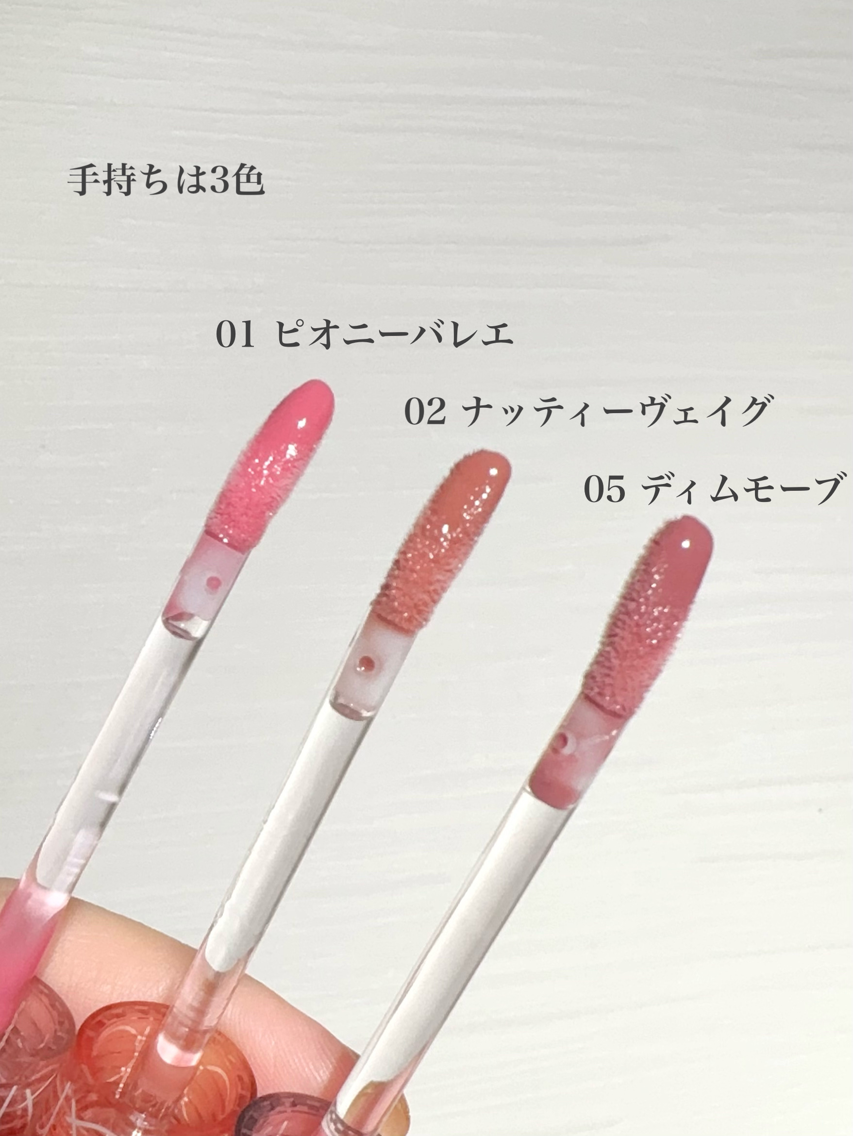 ねっちょりボリューム感あるテクスチャーだけど、ベタつきなく使いやすい。 ティントじゃない普通のグロスだから色もちは良くない。 発色ナチュラルだからこれだけでもいいけど、他のリップと合わせても可愛い!!