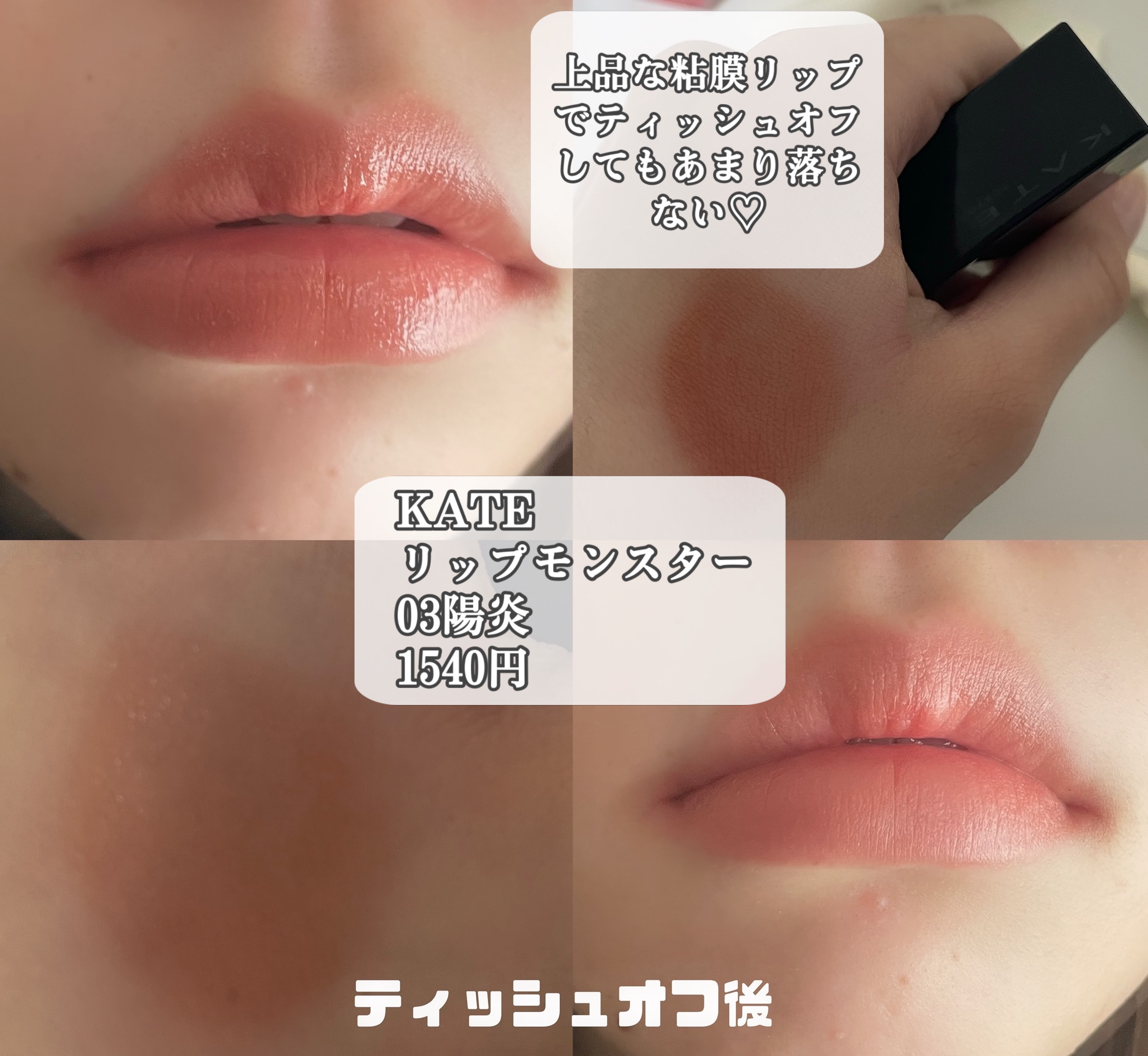 赤の強いオレンジって感じで色が目立つのでこのリップに合わせてメイクすることが多いかも👀 唇だけ変に浮くことはなくて派手だけどかわいい! ティッシュオフしても結構濃く残るからすごく助かる❤️🔥 私がリップモンスターを使う時は2色組みあわせたりすることもあるんだけど、これを使う時はEX1の焦がした茶葉の余韻を上から少し塗っても大人っぽくなって可愛かったです🫶