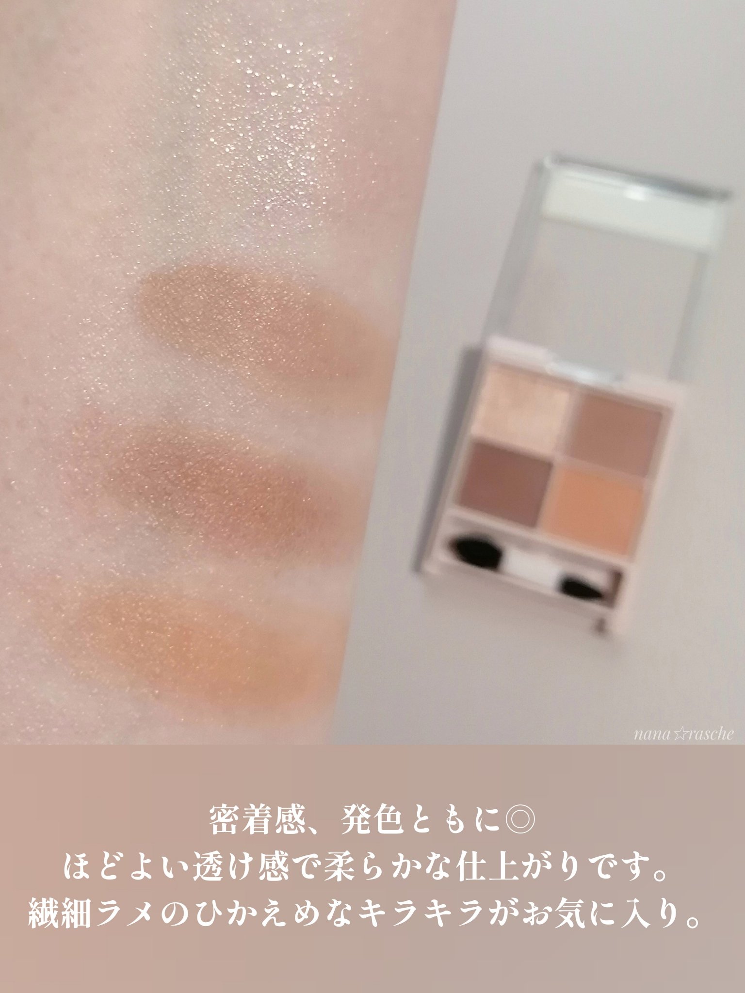 - シルキースフレアイズの姉妹品♡ 肌に溶け込むような透けマットシャドウ 透け感のある柔らかい仕上がりになるマット3色と、透け発色の繊細ラメ1色のパレットシャドウ♡ 完全マットアイや、ラメ×マットアイなど、メイクのパターンを楽しみましょう!