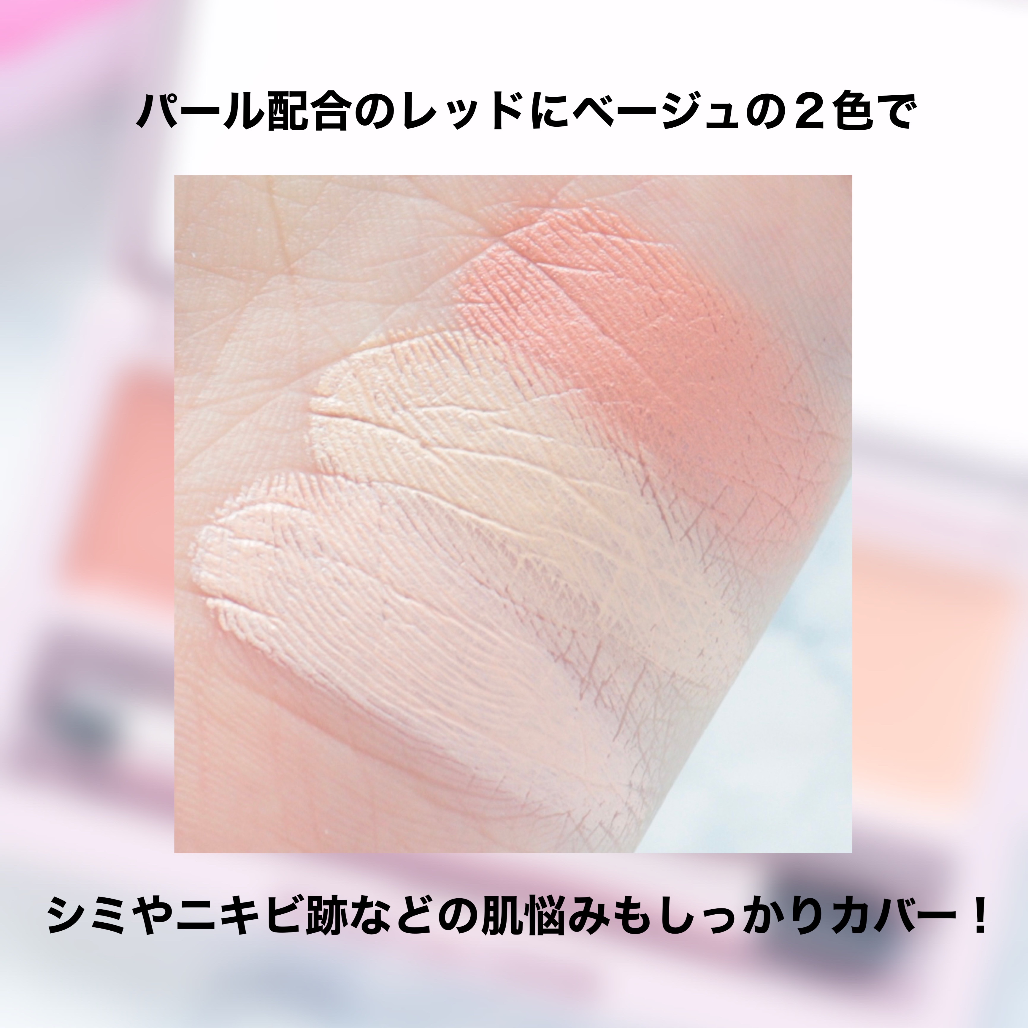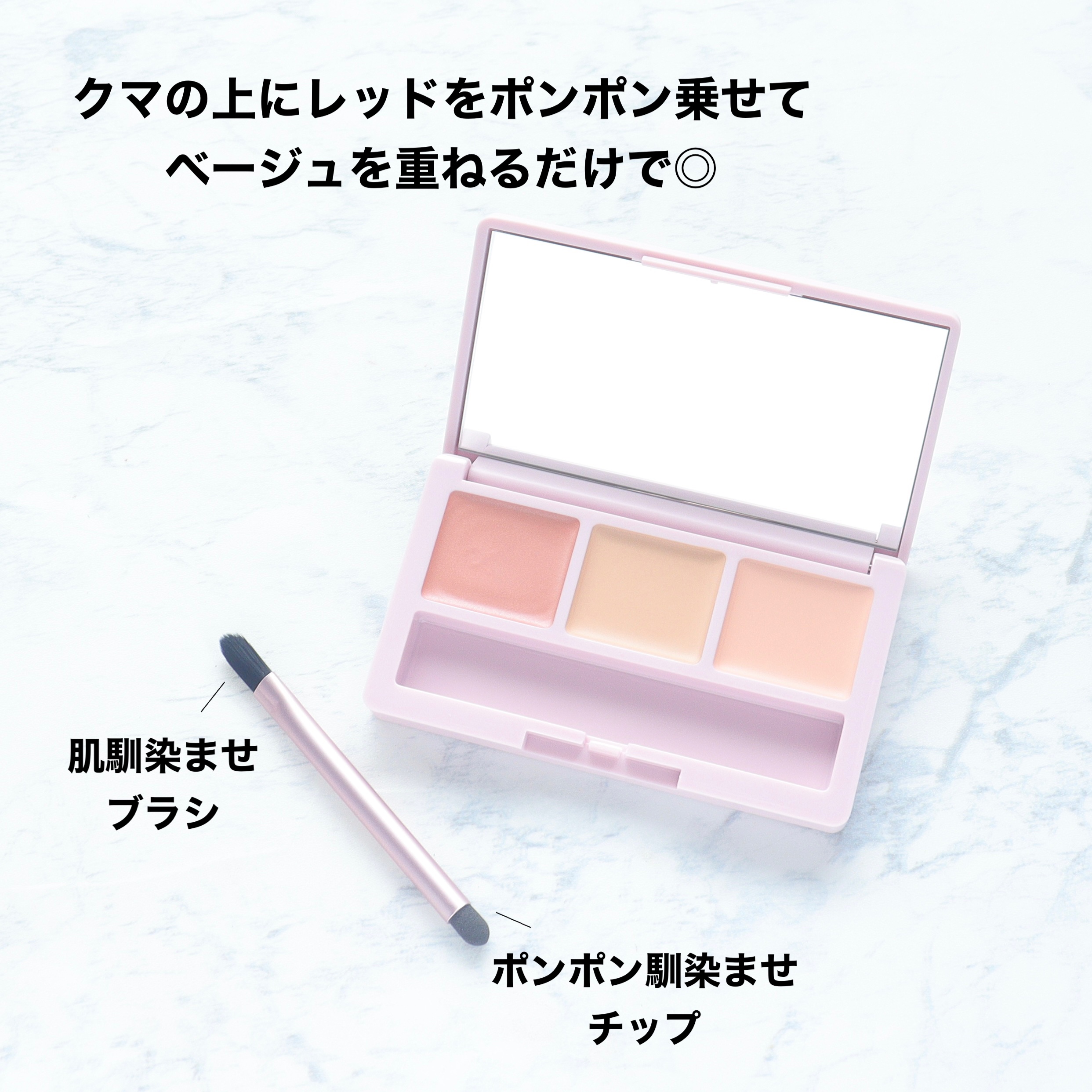 - 自分だけの補正カラーでピタッと密着ハイカバーをかなえるコンシーラーパレット。クマの気になる部分に赤色をぽんぽんとブラシで乗せて、上からベージュを重ねることで自分の肌に合ったオレンジを作ります。 青クマや茶グマの補正色であるレッドが肌に馴染み自然にハイカバー効果を実現。 何度も重ねてカバー力を出すのではなく、色を重ねて肌を補正することでナチュラルに肌をカバーします。