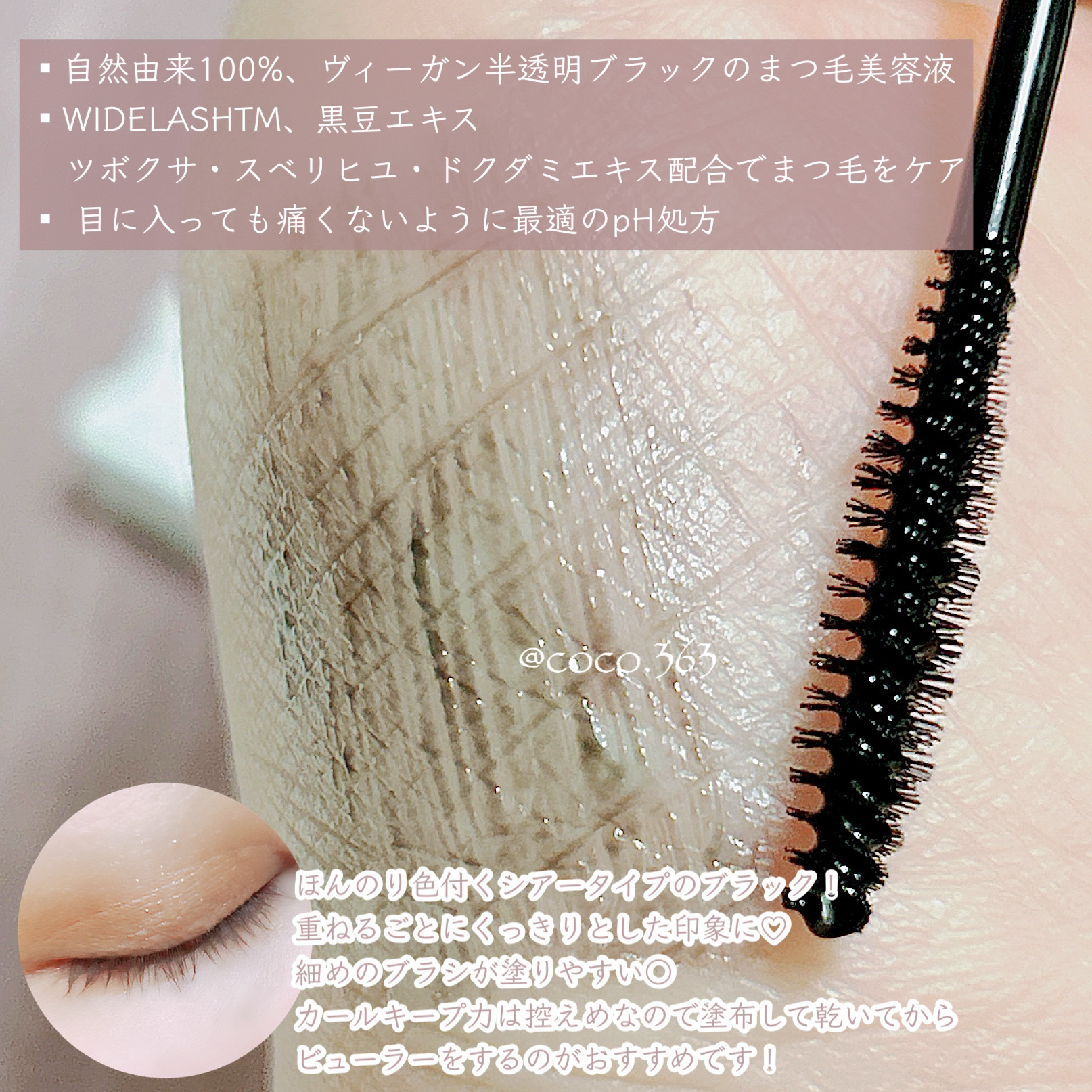 - マスカラにまつ毛美容液効果を加えました。ナチュラルなブラックで目元をより鮮明に演出。美容保湿成分を含んだ伸びの良いジェルテクスチャーがまつ毛に塗った瞬間素早く乾き、まつ毛にハリコシを与えカールを長持ちさせます。 また、ぬるま湯で簡単にオフできるので化粧落としによる摩擦ダメージにも配慮した優しい使い心地。さらに肌刺激テスト完了、ヴィーガン認証済み。(全ての方に皮膚刺激が発生しないということではありません。)