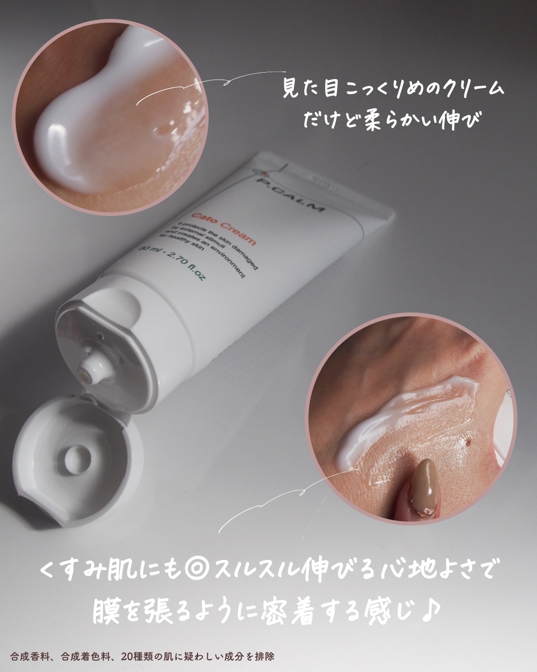 使い切り✍️いつでも使いやすい癖のなさ○P.CALMカトクリーム柔らかいなめらかな塗り心地のクリーム。ベタつかずつややかに馴染み、程よい保湿感のあるすっきりとした使い心地です。ほんのり原料の香りはありますが、無香料なのも嬉しいポイント。朝夜問...