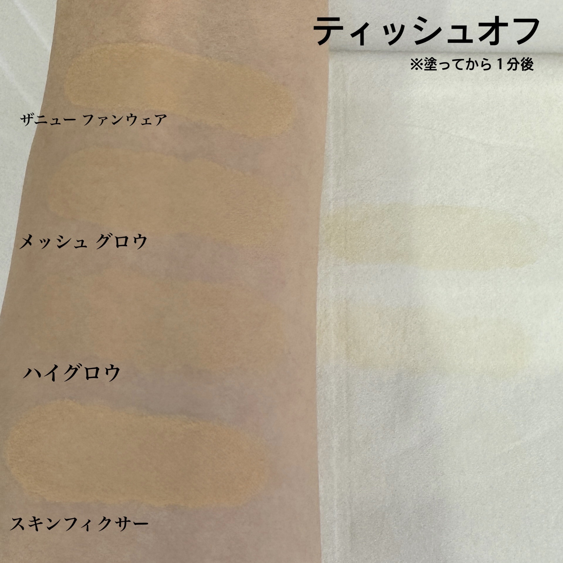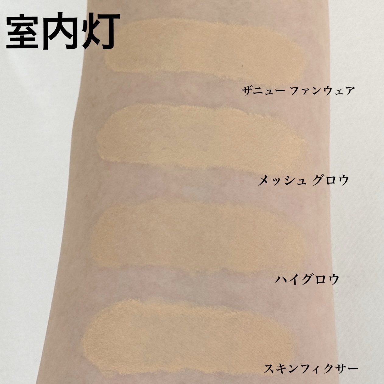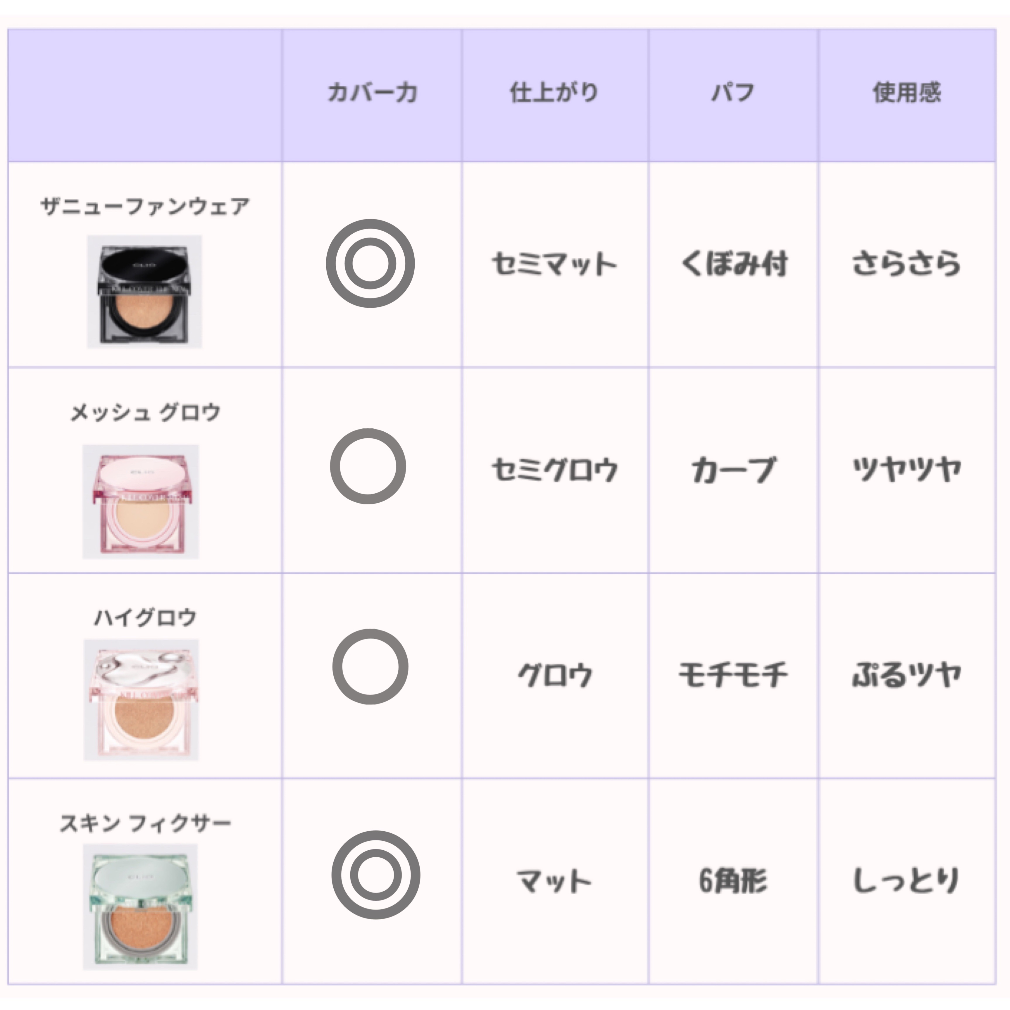 カバー力 黒いのが1番!コンシーラーなくてもシミが隠せてる🖤 べたつき パウダーまでしたようにサラッとしてる緑が好き!表面以外はしっとりして乾燥もなし🌿 仕上がり ザニュー(黒)は"セミマット"!少し前の加工アプリのような陶器肌に🖤 パフ 肌への密着力が高いのは、ハイグロウ!モチモチで肌ダメージも少なそう🥰
